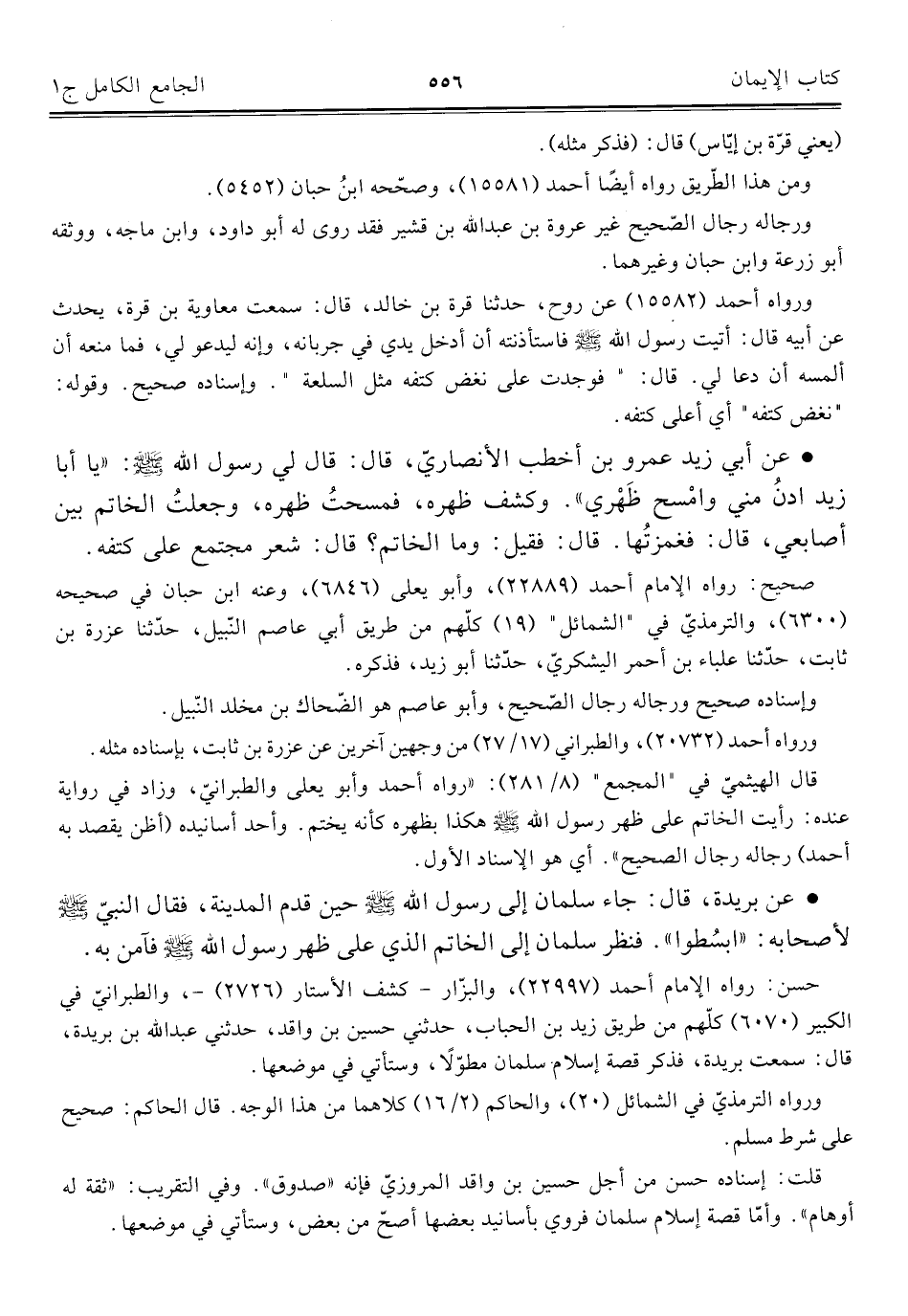 قال الهيثميّ في "المجمع" (٨/ ٢٨١): "رواه أحمد وأبو يعلى والطبرانيّ، وزاد في رواية عنده: رأيت الخاتم على ظهر رسول اللَّه -صلى اللَّه عليه وسلم- هكذا بظهره كأنه بختم. وأحد أسانيده (أظن يقصد به أحمد) رجاله رجال الصحيح. أي هو الإسناد الأول.