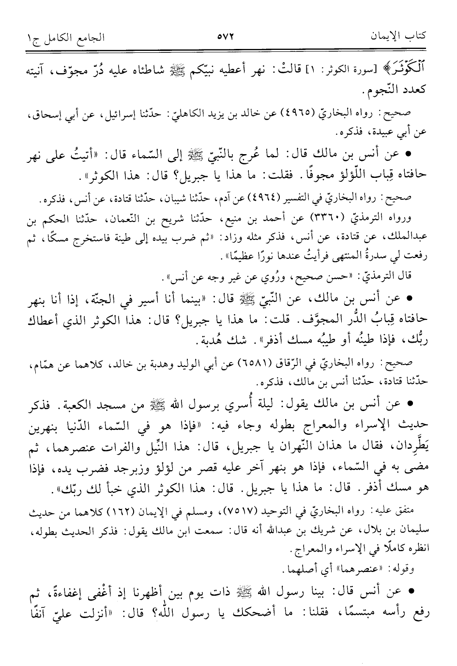 • عن أنس بن مالك قال: لما عُرج بالنّبيّ -صلى اللَّه عليه وسلم- إلى السّماء قال: "أتيتُ على نهر حافتاه قِباب اللؤلؤ مجوفًا. فقلت: ما هذا يا جبريل؟ قال: هذا الكوثر".