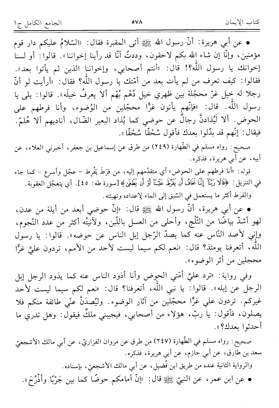 • عن أبي هريرة: أنّ رسول اللَّه -صلى اللَّه عليه وسلم- أتى المقبرة فقال: "السّلامُ عليكم دار قوم مؤمنين، وإنّا إن شاء اللَّه بكم لاحقون، وددتُ أنّا قد رأينا إخواننا". قالوا: أو لسنا إخوانك يا رسول اللَّه؟ ! قال: "أنتم أصحابي، وإخواننا الذين لم يأتوا بعد". فقالوا: كيف نعرف من لم يأت بعد من أمّتك يا رسول اللَّه؟ فقال: "أرأيت لو أنّ رجلا له خيل غرّ محجّلة بين ظهري خيل دُهْم بُهْم ألا يعرفُ خيلَه". قالوا: بلى يا رسول اللَّه. قال: "فإنّهم يأتون غرًّا محجّلين من الوُضوء، وأنا فرطهم على الحوض. ألا لَيُذادنَّ رجالٌ عن حوضي كما يُذاد البعير الضّال، أناديهم ألا هُلمّ. فقال: إنّهم قد بدّلوا بعدك فأقول سُحْقًا سُحْقًا".