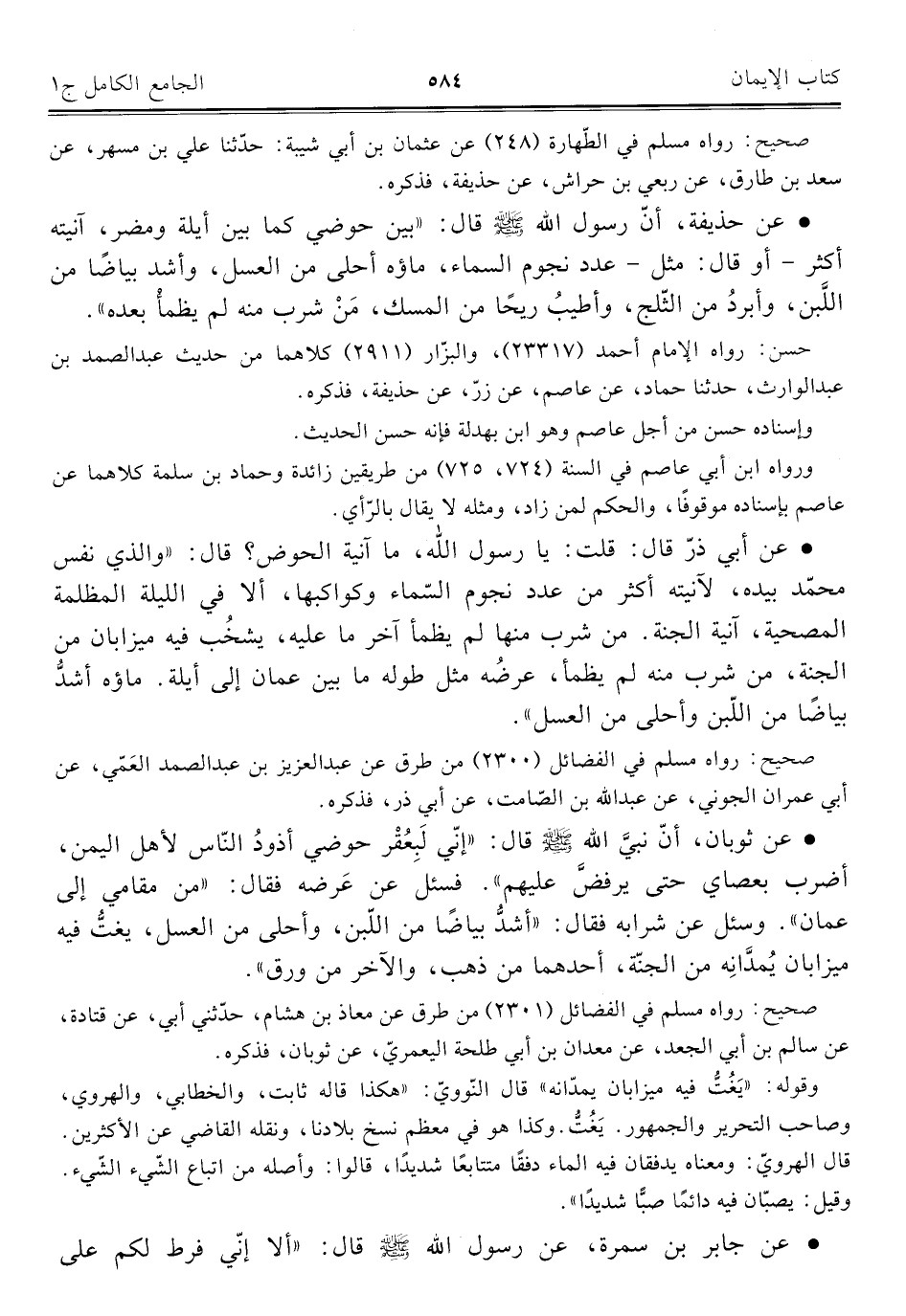 • عن ثوبان، أنَّ نبيَّ اللَّه -صلى اللَّه عليه وسلم- قال: "إنّي لَبِعُقْر حوضي أذودُ النّاس لأهل اليمن، أضرب بعصاي حتى يرفضَّ عليهم". فسئل عن عَرضه فقال: من مقامي إلى عمان". وسئل عن شرابه فقال: "أشدُّ بياضًا من اللّبن، وأحلى من العسل، يغتُّ فيه ميزابان يُمدَّانِه من الجنّة، أحدهما من ذهب، والآخر من ورق".