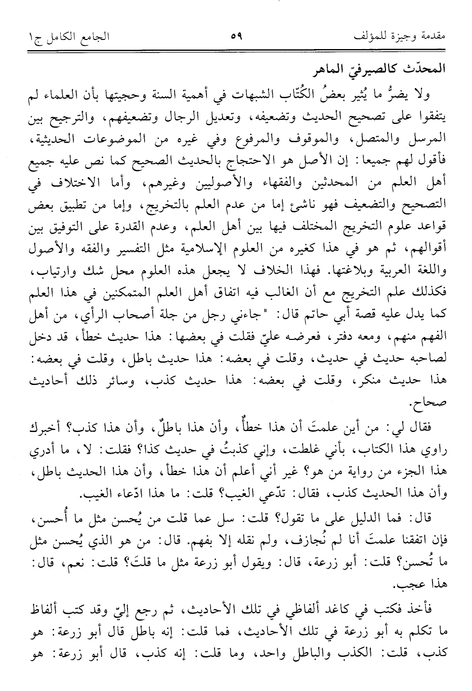 ولا يضرُّ ما يُثير بعضُ الكُتّاب الشبهات في أهمية السنة وحجيتها بأن العلماء لم يتفقوا على تصحيح الحديث وتضعيفه، وتعديل الرجال وتضعيفهم، والترجيح بين المرسل والمتصل، والموقوف والمرفوع وفي غيره من الموضوعات الحديثية، فأقول لهم جميعا: إن الأصل هو الاحتجاج بالحديث الصحيح كما نص عليه جميع أهل العلم من المحدثين والفقهاء والأصوليين وغيرهم، وأما الاختلاف في التصحيح والتضعيف فهو ناشئ إما من عدم العلم بالتخريج، وإما من تطبيق بعض قواعد علوم التخريج المختلف فيها بين أهل العلم، وعدم القدرة على التوفيق بين أقوالهم، ثم هو في هذا كغيره من العلوم الإسلامية مثل التفسير والفقه والأصول واللغة العربية وبلاغتها، فهذا الخلاف لا يجعل هذه العلوم محل شك وارتياب، فكذلك علم التخريج مع أن الغالب فيه اتفاق أهل العلم المتمكنين في هذا العلم كما يدل عليه قصة أبي حاتم قال: "جاءني رجل من جلة أصحاب الرأي، من أهل الفهم منهم، ومعه دفتر، فعرضه عليّ فقلت في بعضها: هذا حديث خطأ، قد دخل لصاحبه حديث في حديث، وقلت في بعضه: هذا حديث باطل، وقلت في بعضه: هذا حديث منكر، وقلت في بعضه: هذا حديث كذب، وسائر ذلك أحاديث صحاح.