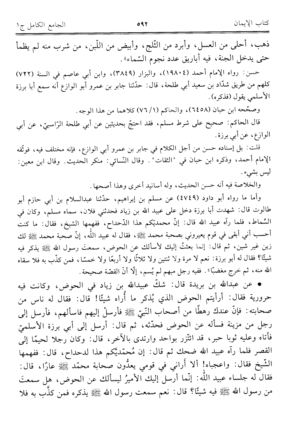 وأمّا ما رواه أبو داود (٤٧٤٩) عن مسلم بن إبراهيم، حدّثنا عبد السّلام بن أبي حازم أبو طالوت قال: شهدت أبا برزة دخل على عبيد اللَّه بن زياد فحدثني فلان، سماه مسلم، وكان في السِّماط، فلما رآه عبيد اللَّه قال: إنّ محمديّكم هذا الدّحداح، ففهمها الشيخ، فقال: ما كنت أحسب أني أبقى في قوم يعيروني بصحبة محمد -صلى اللَّه عليه وسلم-، فقال له عبيد اللَّه، إنّ صحبة محمد -صلى اللَّه عليه وسلم- لك زين غير شين، ثم قال: إنّما بعثتُ إليك لأسألك عن الحوض، سمعتَ رسول اللَّه -صلى اللَّه عليه وسلم- يذكر فيه شيئًا؟ فقال له أبو برزة: نعم لا مرة ولا ثنتين ولا ثلاثًا ولا أربعًا ولا خمسًا، فمن كذّب به فلا سقاه اللَّه منه، ثم خرج مغضبًا". ففيه رجل مبهم لم يُسم، إِلَّا أَنَّ القصّة صحيحة.