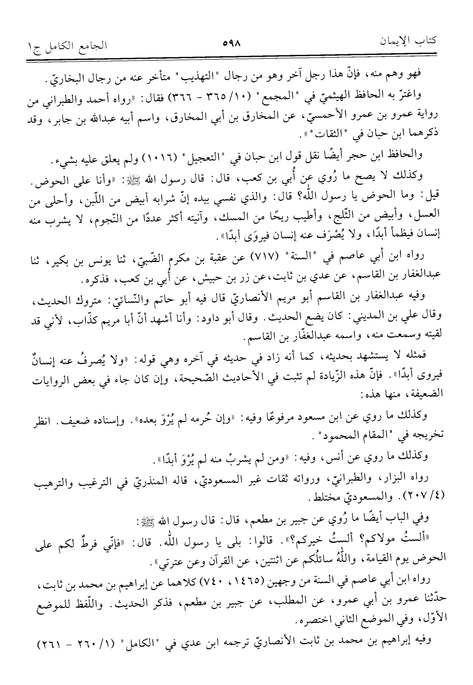 رواه ابن أبي عاصم في "السنة" (٧١٧) عن عقبة بن مكرم الضّبيّ، ثنا يونس بن بكير، ثنا عبد الغفار بن القاسم، عن عدي بن ثابت، عن زر بن حبيش، عن أُبي بن كعب، فذكره.