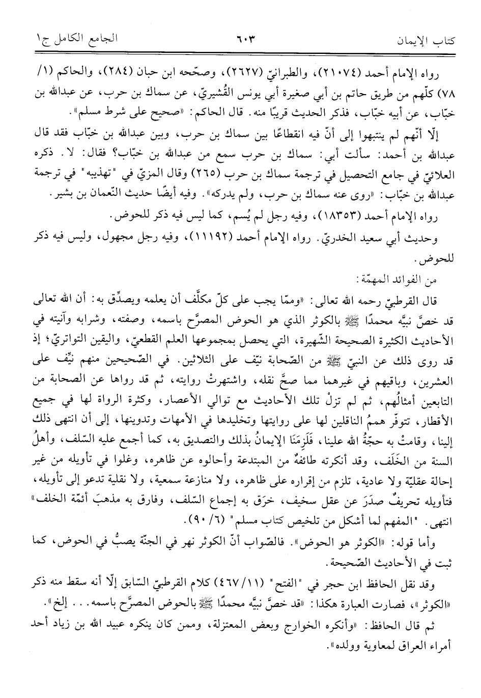 قال القرطبيّ رحمه اللَّه تعالى: "ومما يجب على كلّ مكلَّف أنّ يعلمه ويصدِّق به: أن اللَّه تعالى قد خصَّ نبيَّه محمدًا -صلى اللَّه عليه وسلم- بالكوثر الذي هو الحوض المصرَّح باسمه، وصفته، وشرابه وآنيته في الأحاديث الكثيرة الصحيحة الشّهيرة، التي يحصل بمجموعها العلم القطعيّ، واليقين التواتريّ؛ إذ قد روى ذلك عن النبيّ -صلى اللَّه عليه وسلم- من الصّحابة نيّف على الثلاثين. في الصّحيحين منهم نيِّف على العشرين، وباقيهم في غيرهما مما صحَّ نقله، واشتهرتْ روايته، ثم قد رواها عن الصحابة من التابعين أمثالُهم، ثم لم تزلْ تلك الأحاديث مع توالي الأعصار، وكثرة الرواة لها في جميع الأقطار، تتوفّر هممُ الناقلين لها على روايتها وتخليدها في الأمهات وتدوينها، إلى أن انتهى ذلك إلينا، وقامتْ به حجّةُ اللَّه علينا، فَلَزِمَنَا الإيمانُ بذلك والتصديق به، كما أجمع عليه السّلف، وأهلُ السنة من الخَلَف، وقد أنكرته طائفةٌ من المبتدعة وأحالوه عن ظاهره، وغلوا في تأويله من غير إحالة عقليّة ولا عادية، تلزم من إقراره على ظاهره، ولا منازعة سمعية، ولا نقلية تدعو إلى تأويله، فتأويله تحريفٌ صدَرَ عن عقل سخيف، خرَق به إجماع السّلف، وفارق به مذهبَ أئمّة الخلف" انتهى. "المفهم لما أشكل من تلخيص كتاب مسلم" (٦/ ٩٠).