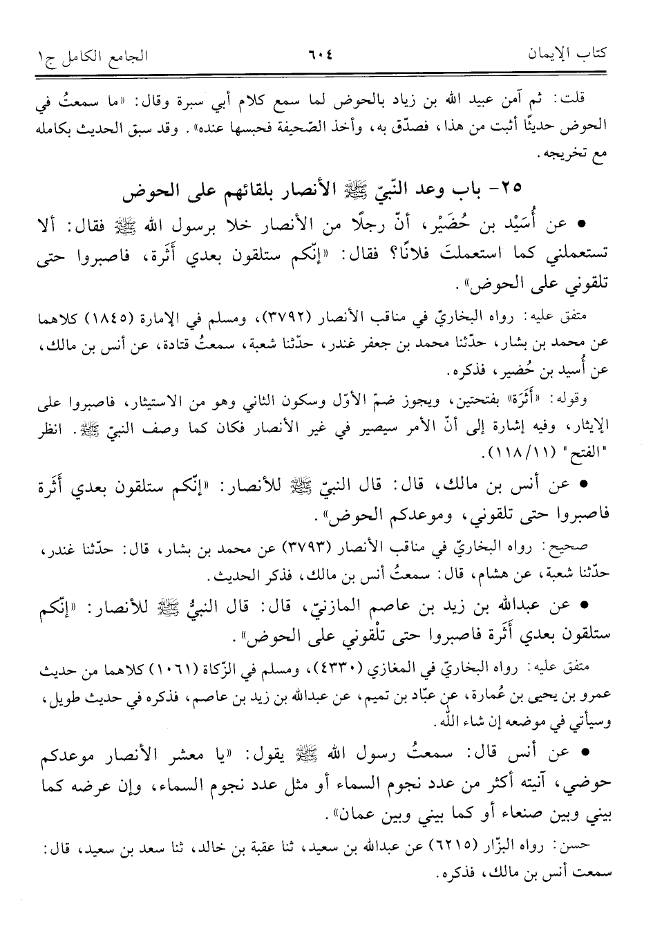 • عن عبد اللَّه بن زيد بن عاصم المازنيّ، قال: قال النبيُّ -صلى اللَّه عليه وسلم- للأنصار: "إنّكم ستلقون بعدي أَثَرة فاصبروا حتى تلْقوني على الحوض".