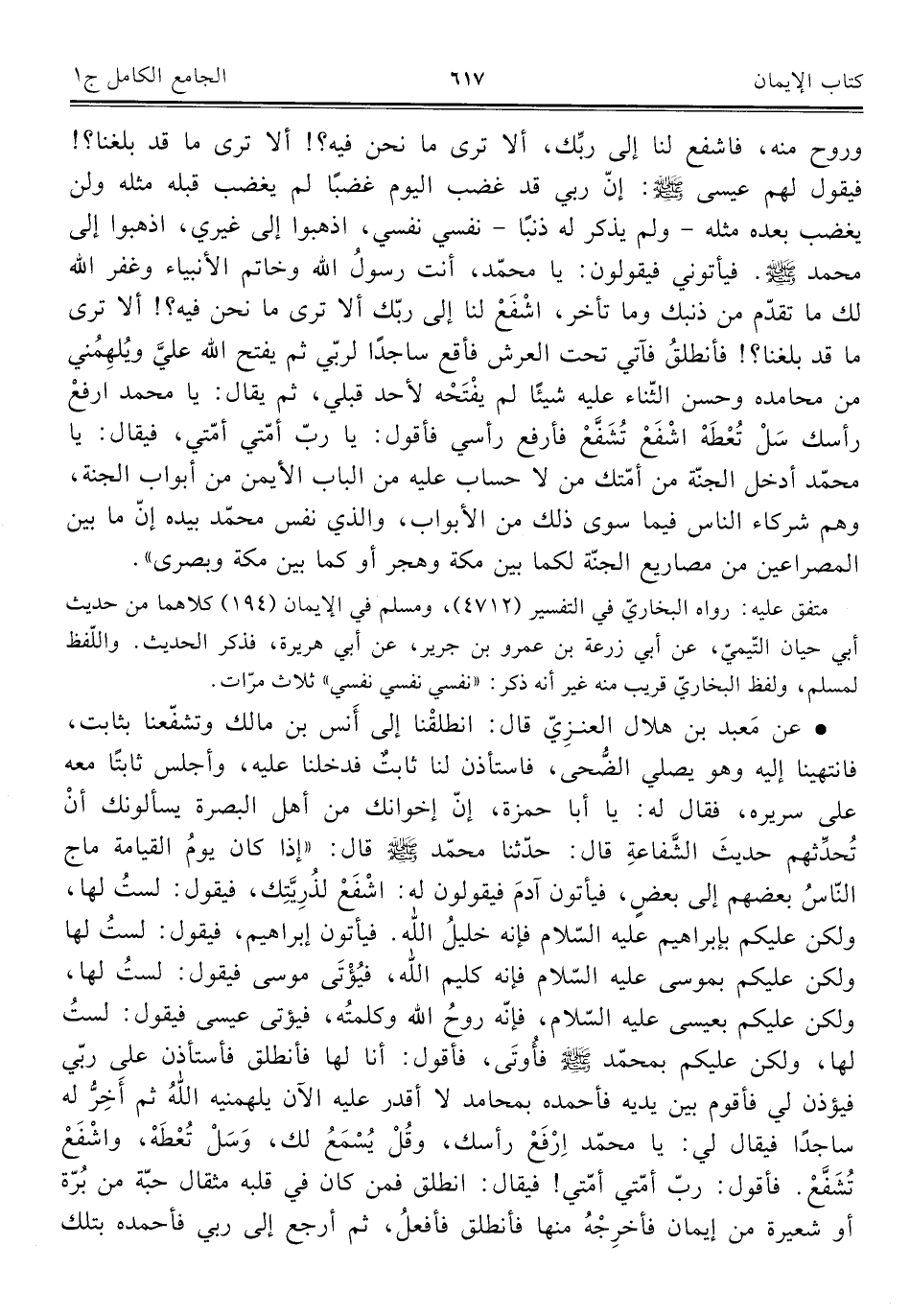• عن مَعبد بن هلال العنزِيّ قال: انطلقْنا إلى أَنس بن مالك وتشفّعنا بثابت، فانتهينا إليه وهو يصلي الضُّحى، فاستأذن لنا ثابتٌ فدخلنا عليه، وأجلس ثابتًا معه على سريره، فقال له: يا أبا حمزة، إنّ إخوانك من أهل البصرة يسألونك أنْ تُحدِّثهم حديثَ الشَّفاعةِ قال: حدّثنا محمّد -صلى اللَّه عليه وسلم- قال: "إذا كان يومُ القيامة ماج النّاسُ بعضهم إلى بعضٍ، فيأتون آدمَ فيقولون له: اشْفَعْ لذُرِيِّتِك، فيقول: لستُ لها، ولكن عليكم بإبراهيم عليه السّلام فإنه خليلُ اللَّه. فيأتون إبراهيم، فيقول: لستُ لها ولكن عليكم بموسى عليه السّلام فإنه كليم اللَّه، فيُؤْتَى موسى فيقول: لستُ لها، ولكن عليكم بعيسى عليه السّلام، فإنه روح اللَّه وكلمه، فيؤتى عيسى فيقول: لستُ لها، ولكن عليكم بمحمّد -صلى اللَّه عليه وسلم- فأُوتَى، فأقول: أنا لها فأنطلق فأستأذن على ربّي فيؤذن لي فأقوم بين يديه فأحمده بمحامد لا أقدر عليه الآن يلهمنيه اللَّهُ ثم أَخِرُّ له ساجدًا فيقال لي: يا محمّد ارْفَعْ رأسك، وقُلْ يُسْمَعُ لك، وَسَلْ تُعْطَهْ، واشْفَعْ تُشَفَّعْ. فأقول: ربّ أمّتي أمّتي! فيقال: انطلق فمن كان في قلبه مثقال حبّة من بُرّة أو شعيرة من إيمان فأخرِجْهُ منها فأنطلق فأفعلُ، ثم أرجع إلى ربي فأحمده بتلك