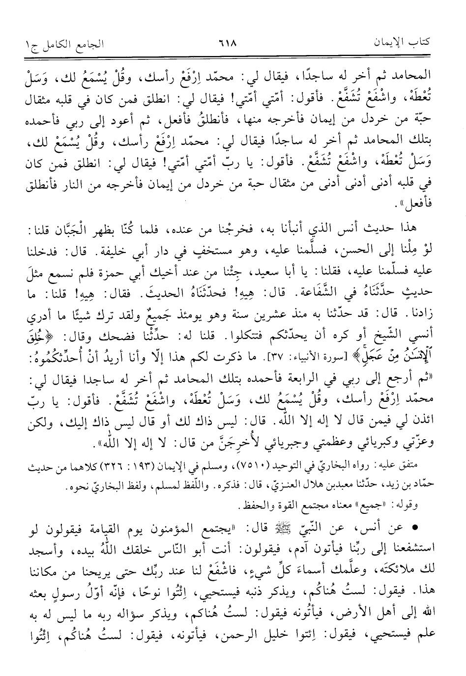 هذا حديث أنس الذي أنبأنا به، فخرجْنا من عنده، فلما كُنّا بظهر الْجَبَّان قلنا: لوْ مِلْنا إلى الحسن، فسلَّمنا عليه، وهو مستخفٍ في دار أبي خليفة. قال: فدخلنا عليه فسلّمنا عليه، فقلنا: يا أبا سعيد، جِئْنا من عند أخيك أبي حمزة فلم نسمع مثلَ حديثٍ حدَّثَنَاهُ في الشَّفَاعة، قال: هِيهِ! فحدّثَنَاهُ الحديثَ. فقال: هِيهِ! قلنا: ما زادنا. قال: قد حدّثنا به منذ عشرين سنة وهو يومئذ جَميعٌ ولقد ترك شيئًا ما أدري أنسي الشّيخ أو كره أن يحدّثكم فتتكلوا. قلنا له: حدِّثْنا فضحك وقال: {خُلِقَ الْإِنْسَانُ مِنْ عَجَلٍ} [سورة الأنبياء: ٣٧]. ما ذكرت لكم هذا إلّا وأنا أريدُ أنْ أُحدِّثكُمُوهُ: "ثم أرجع إلى ربي في الرابعة فأحمده بتلك المحامد ثم أخر له ساجدًا فيقال لي: محمّد ارْفَعْ رأسك، وقُلْ يُسْمَعُ لك، وَسَلْ تُعْطَهْ، واشْفَعْ تُشَفَّعْ. فأقول: يا ربّ ائذن لي فيمن قال لا إله إلّا اللَّه. قال: ليس ذاك لك أو قال ليس ذاك إليك، ولكن وعزّتي وكبريائي وعظمتي وجبريائي لأُخرِجَنَّ من قال: لا إله إلّا اللَّه".