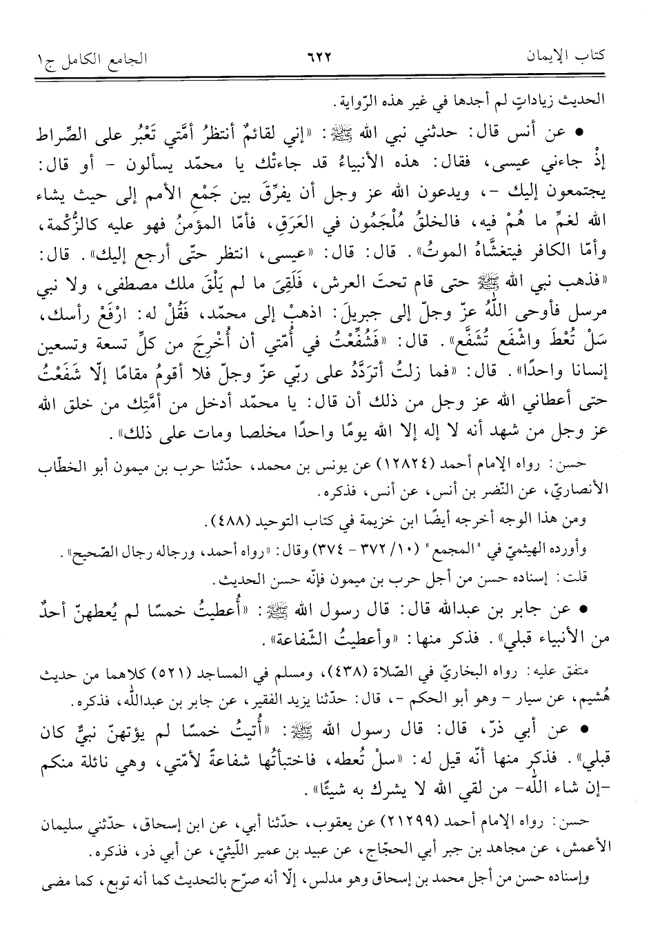 • عن أنس قال: حدثني نبي اللَّه -صلى اللَّه عليه وسلم-: "إني لقائمٌ أنتظرُ أمَّتي تَعْبُر على الصِّراط إذْ جاءني عيسى، فقال: هذه الأنبياءُ قد جاءتْك يا محمّد يسألون -أو قال: يجتمعون إليك-، ويدعون اللَّه عز وجل أن يفرِّقَ بين جَمْعِ الأمم إلى حيث يشاء اللَّه لغمِّ ما هُمْ فيه، فالخلقُ مُلْجَمُون في العَرَقِ، فأمّا المؤمنُ فهو عليه كالزُّكْمة، وأمّا الكافر فيتغشَّاهُ الموتُ". قال: قال: "عيسى، انتظر حتّى أرجع إليك". قال: "فذهب نبي اللَّه -صلى اللَّه عليه وسلم- حتى قام تحتَ العرش، فَلَقِيَ ما لم يَلْقَ ملك مصطفى، ولا نبي مرسل فأوحى اللَّهُ عزّ وجلّ إلى جبريلَ: اذهبْ إلى محمّد، فَقُلْ له: ارْفَعْ رأسك، سَلْ تُعْطَ واشْفَع تُشَفَّع". قال: "فَشُفِّعْتُ في أُمّتي أن أُخْرِجَ من كلِّ تسعة وتسعين إنسانا واحدًا". قال: "فما زلتُ أترَدَّدُ على ربّي عزّ وجلّ فلا أقومُ مقامًا إلّا شَفَعْتُ حتى أعطاني اللَّه عز وجل من ذلك أن قال: يا محمّد أدخل من أمَّتِك من خلق اللَّه عز وجل من شهد أنه لا إله إلا اللَّه يومًا واحدًا مخلصا ومات على ذلك".