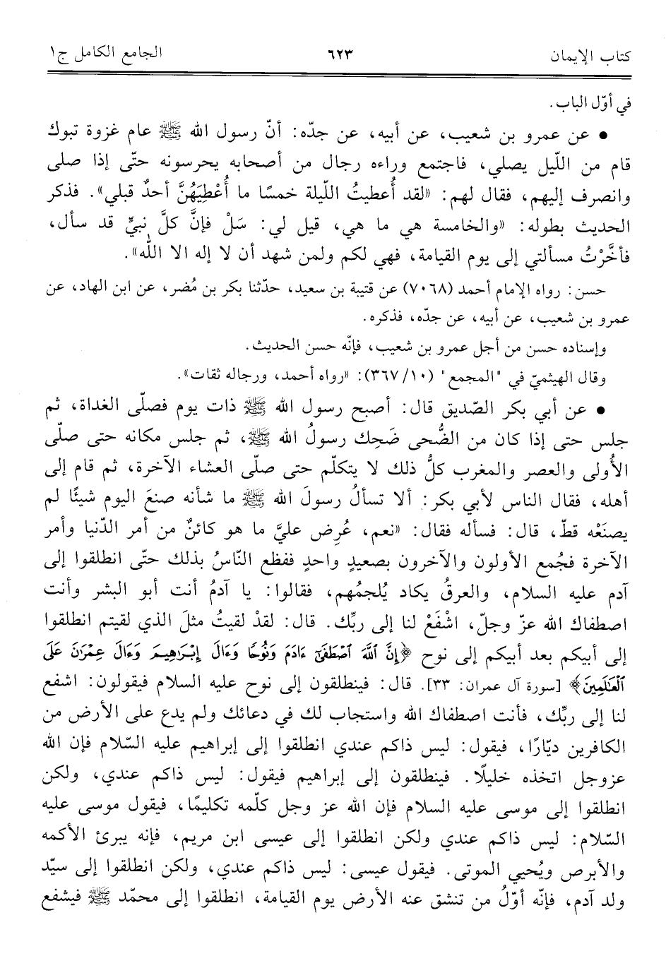 • عن عمرو بن شعيب، عن أبيه، عن جده: أنّ رسول اللَّه -صلى اللَّه عليه وسلم- عام غزوة تبوك قام من اللّيل يصلي، فاجتمع وراءه رجال من أصحابه يحرسونه حتّى إذا صلى وانصرف إليهم، فقال لهم: "لقد أُعطيتُ اللّيلة خمسًا ما أُعْطِيَهُنَّ أحدٌ قبلي". فذكر الحديث بطوله: "والخامسة هي ما هي، قيل لي: سَلْ فإنَّ كلَّ نبيٍّ قد سأل، فأخَّرْتُ مسألتي إلى يوم القيامة، فهي لكم ولمن شهد أن لا إله الا اللَّه".