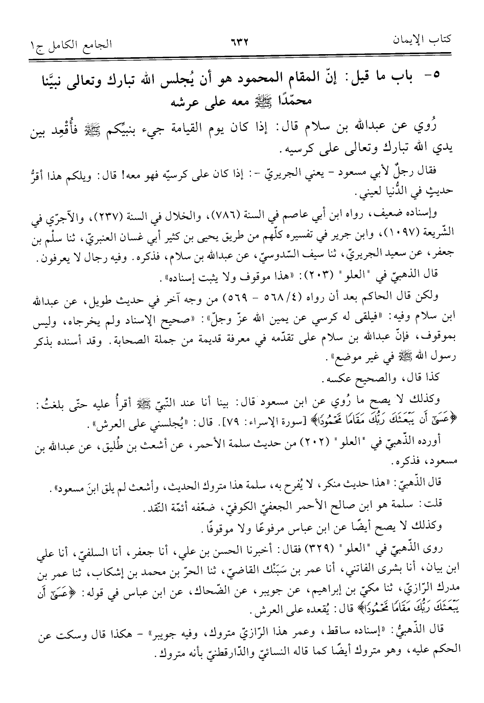 ٥ - باب ما قيل: إنّ المقام المحمود هو أن يُجلس اللَّه تبارك وتعالى نبيَّنا محمّدًا -صلى اللَّه عليه وسلم- معه على عرشه