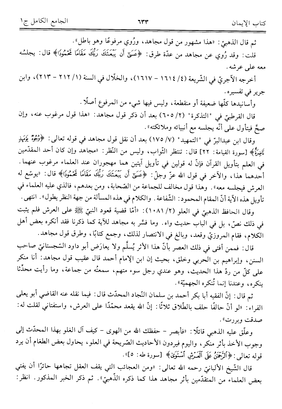 وقال ابن عبد البر في "التمهيد" (٧/ ١٧٥) بعد أن نقل قول مجاهد في قوله تعالى: {وُجُوهٌ يَوْمَئِذٍ نَاضِرَةٌ} [سورة القيامة: ٢٢] قال: تنتظر الثّواب، وليس من النّظر: "مجاهد وإن كان أحد المقدّمين في العلم بتأويل القرآن فإنّ له قولين في تأويل آيتين هما مهجوران عند العلماء مرغوب عنهما. أحدهما هذا، والآخر في قول اللَّه عزّ وجلّ: {عَسَى أَنْ يَبْعَثَكَ رَبُّكَ مَقَامًا مَحْمُودًا} قال: "يوسّع له العرش فيجلسه معه". وهذا قول مخالف للجماعة من الصّحابة، ومن بعدهم، فالذي عليه العلماء في تأويل هذه الآية أنّ المقام المحمود: الشّفاعة، والكلام في هذه المسألة من جهة النظر يطول". انتهى