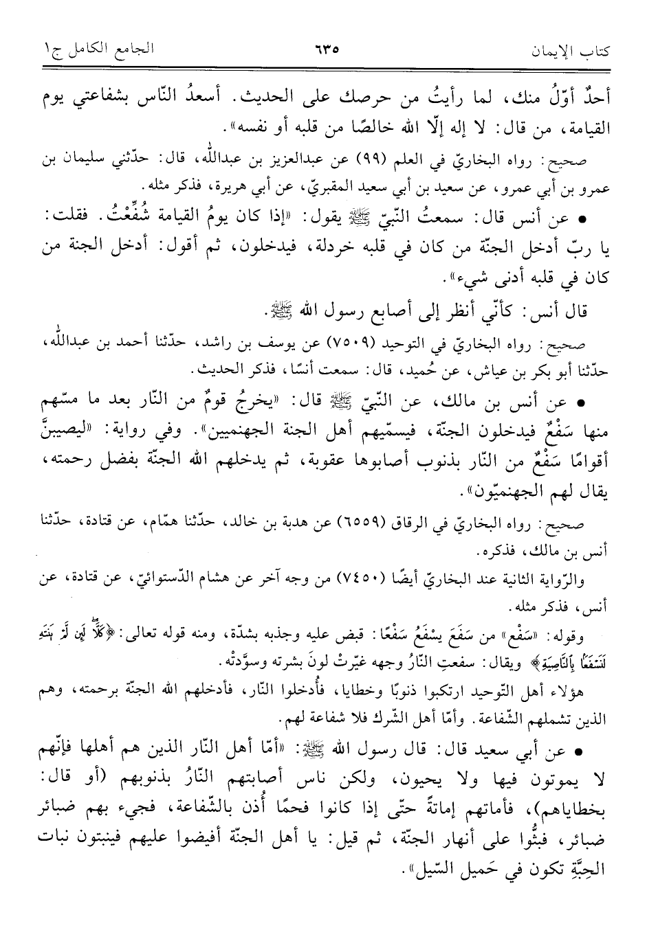 • عن أنس قال: سمعتُ النّبيّ -صلى اللَّه عليه وسلم- يقول: "إذا كان يومُ القيامة شُفِّعْتُ. فقلت: يا ربّ أدخل الجنّة من كان في قلبه خردلة، فيدخلون، ثم أقول: أدخل الجنّة من كان في قلبه أدنى شيء".