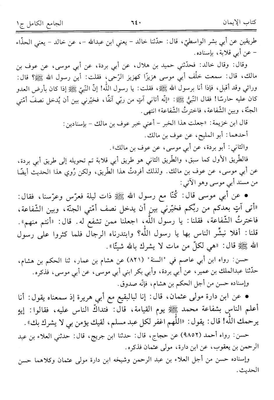 • عن أبي موسى قال: كُنّا مع رسول اللَّه -صلى اللَّه عليه وسلم- ذات ليلة فعرّس وعرّسنا، فقال: "أتي آتٍ بعدكم من ربِّكم فخيّرني بين أن يدخل نصف أمّتي الجنّة، وبين الشّفاعة، فاخترتُ الشّفاعة، فقلنا: يا رسول اللَّه، اجعلنا ممن تشفع له. قال: "أنتم منهم". قلنا: أفلا نبشِّر النّاس بها يا رسول اللَّه؟ وابتدرناه الرجال فلما كثروا على رسول اللَّه -صلى اللَّه عليه وسلم- قال: "هي لكلّ من مات لا يشرك باللَّه شيئًا".