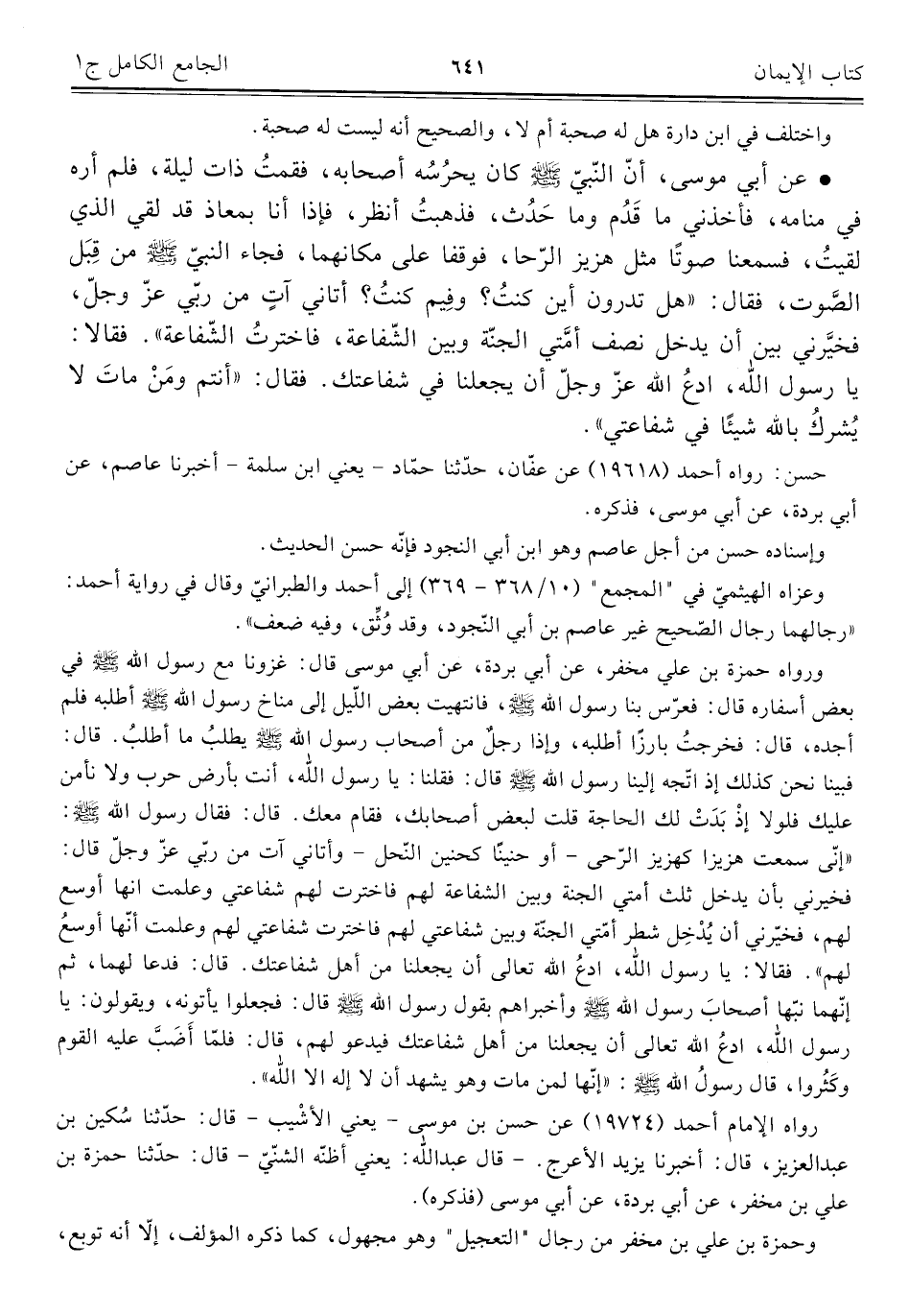 • عن أبي موسى، أنّ النّبيّ -صلى اللَّه عليه وسلم- كان يحرُسُه أصحابه، فقمتُ ذات ليلة، فلم أره في منامه، فأخذني ما قَدُم وما حدث، فذَهبتُ أنظر، فإذا أنا بمعاذ قد لقي الذي لقيتُ، فسمعنا صوتًا مثل هزيز الرحا، فوقفا على مكانهما، فجاء النبيّ -صلى اللَّه عليه وسلم- من قِبَل الصَّوت، فقال: "هل تدرون أين كنتُ؟ وفِيم كنتُ؟ أتاني آتٍ من ربّي عزّ وجلّ، فخيَّرني بين أن يدخل نصف أمَّتي الجنّة وبين الشّفاعة، فاخترتُ الشّفاعة". فقالا: يا رسول اللَّه، ادعُ اللَّه عزّ وجلّ أن يجعلنا في شفاعتك. فقال: "أنتم ومَنْ ماتَ لا يُشركُ باللَّه شيئًا في شفاعتي".