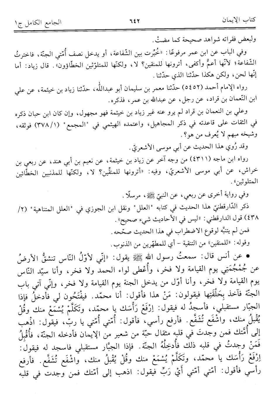 • عن أنس قال: سمعتُ رسول اللَّه -صلى اللَّه عليه وسلم- يقول: "إنّي لأوّلُ النّاس تنشقُّ الأرضُ عن جُمْجُمَتِي يوم القيامة ولا فخر، وأُعْطي لواء الحمد ولا فخر، وأنا سيّد النّاس يوم القيامة ولا فخر، وأنا أوّل من يدخل الجنّة يوم القيامة ولا فخر، وإنّي آتي باب الجنّة فآخذ بِحَلْقَتِها فيقولون: مَنْ هذا فأقول: أنا محمّد. فيفْتَحُون لي فأدخلُ فإذا الجبّار مستقبلي، فأسجدُ له فيقول: ارْفَعْ رَأْسَك يا محمّد، وتَكَلَّمْ يُسْمَعْ منك وقُلْ يُقْبلُ منك، واشْفَع تُشَفَّع. فأرفع رأسي، فأقول: أُمّتي أُمّتي يا ربّ، فيقول: اذْهب إلى أُمَّتك فمن وجدتَ في قلبه مثقال حبّة من شعير من الإيمان فأدخله الجنّة، فأُقْبِلُ فَمَنْ وجدتُ في قلبه ذلك فأُدخِلُهُ الجنّة. فإذا الجبَّار مستقبلي فاسجد له فيقول: ارْفَعْ رَأْسَك يا محمّد، وتَكَلَّمْ يُسْمَعْ منك وقُلْ يُقْبلُ منك، واشْفَع تُشَفَّع. فأرفع رأسي فأقول: أمّتي أمّتي أَيْ رَبِّ فيقول: اذهب إلى أمّتك فمن وجدت في قلبه