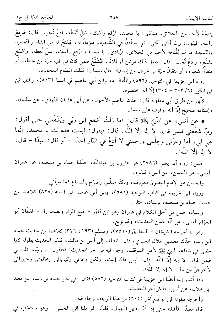 وقد أشار إليه أيضًا ابن خزيمة في كتاب التوحيد (٥٨٢) فقال: في خبر حماد بن زيد، عن معبد ابن هلال، عن أنس، فذكر آخر الحديث.