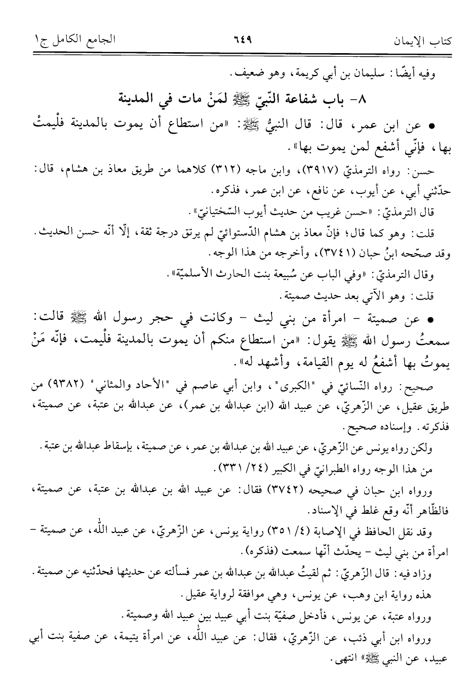 • عن ابن عمر، قال: قال النبيُّ -صلى اللَّه عليه وسلم-: "من استطاع أن يموت بالمدينة فلْيمتْ بها، فإنّي أشفع لمن يموت بها".