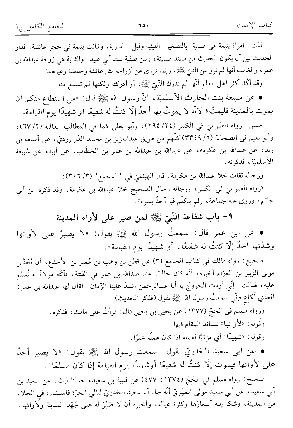 • عن ابن عمر قال: سمعتُ رسول اللَّه -صلى اللَّه عليه وسلم- يقول: "لا يصبرْ على لأوائها وشدّتها أحدٌ إلا كنتُ له شفيعًا، أو شهيدًا يوم القيامة".
