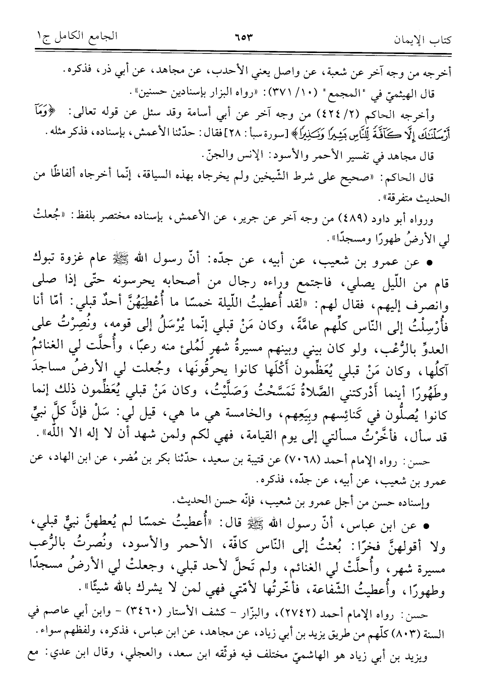 • عن عمرو بن شعيب، عن أبيه، عن جدّه: أنّ رسول اللَّه -صلى اللَّه عليه وسلم- عام غزوة تبوك قام من اللّيل يصلي، فاجتمع وراءه رجال من أصحابه يحرسونه حتّى إذا صلى وانصرف إليهم، فقال لهم: "لقد أُعطيتُ اللّيلة خمسًا ما أُعْطِيَهُنَّ أحدٌ قبلي: أمّا أنا فأُرْسِلْتُ إلى النّاس كلِّهم عامَّةً، وكان مَنْ قبلي إنّما يُرْسَلُ إلى قومه، ونُصِرْتُ على العدوِّ بالرُّعْب، ولو كان بيني وبينهم مسيرةُ شهرٍ لَمُلئ منه رعبًا، وأُحلَّت لي الغنائمُ آكلُها، وكان مَنْ قبلي يُعَظِّمون أَكْلَها كانوا يحرقُونَها، وجُعلت لي الأرضُ مساجدَ وطَهُورًا أينما أَدْركتني الصَّلاةُ تَمَسَّحْتُ وَصَلَّيْتُ، وكان مَنْ قبلي يُعَظِّمون ذلك إنما كانوا يُصلُّون في كَنائِسهم وبِيَعِهم، والخامسة هي ما هي، قيل لي: سَلْ فإنَّ كلَّ نبيٍّ قد سأل، فأخَّرْتُ مسألتي إلى يوم القيامة، فهي لكم ولمن شهد أن لا إله الا اللَّه".