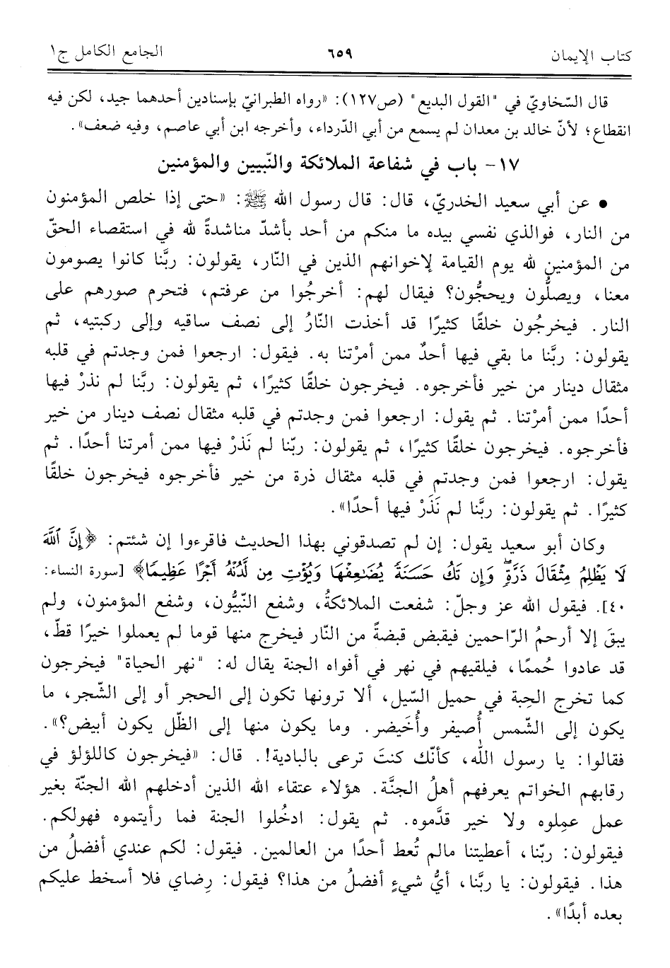 وكان أبو سعيد يقول: إن لم تصدقوني بهذا الحديث فاقرءوا إن شئتم: {إِنَّ اللَّهَ لَا يَظْلِمُ مِثْقَالَ ذَرَّةٍ وَإِنْ تَكُ حَسَنَةً يُضَاعِفْهَا وَيُؤْتِ مِنْ لَدُنْهُ أَجْرًا عَظِيمًا} [سورة النساء: ٤٠]. فيقول اللَّه عز وجلّ: شفعت الملائكةُ، وشفع النّبيُّون، وشفع المؤمنون، ولم يبقَ إلا أرحمُ الرّاحمين فيقبض قبضةً من النّار فيخرج منها قوما لم يعملوا خيرًا قطّ، قد عادوا حُممًا، فيلقيهم في نهر في أفواه الجنّة يقال له: "نهر الحياة" فيخرجون كما تخرج الحِبة في حميل السّيل، ألا ترونها تكون إلى الحجر أو إلى الشّجر، ما يكون إلى الشّمس أُصيفر وأُخَيضر. وما يكون منها إلى الظّل يكون أبيض؟ ". فقالوا: يا رسول اللَّه، كأنّك كنتَ ترعى بالبادية! . قال: "فيخرجون كاللؤلؤ في رقابهم الخواتم يعرفهم أهلُ الجنَّة. هؤلاء عتقاء اللَّه الذين أدخلهم اللَّه الجنّة بغير عمل عمِلوه ولا خير قدَّموه. ثم يقول: ادخُلوا الجنّة فما رأيتموه فهو لكم. فيقولون: ربّنا، أعطيتنا ما لم تُعط أحدًا من العالمين. فيقول: لكم عندي أفضلُ من هذا. فيقولون: يا ربَّنا، أيُّ شيءٍ أفضلُ من هذا؟ فيقول: رِضاي فلا أسخط عليكم بعده أبدًا".