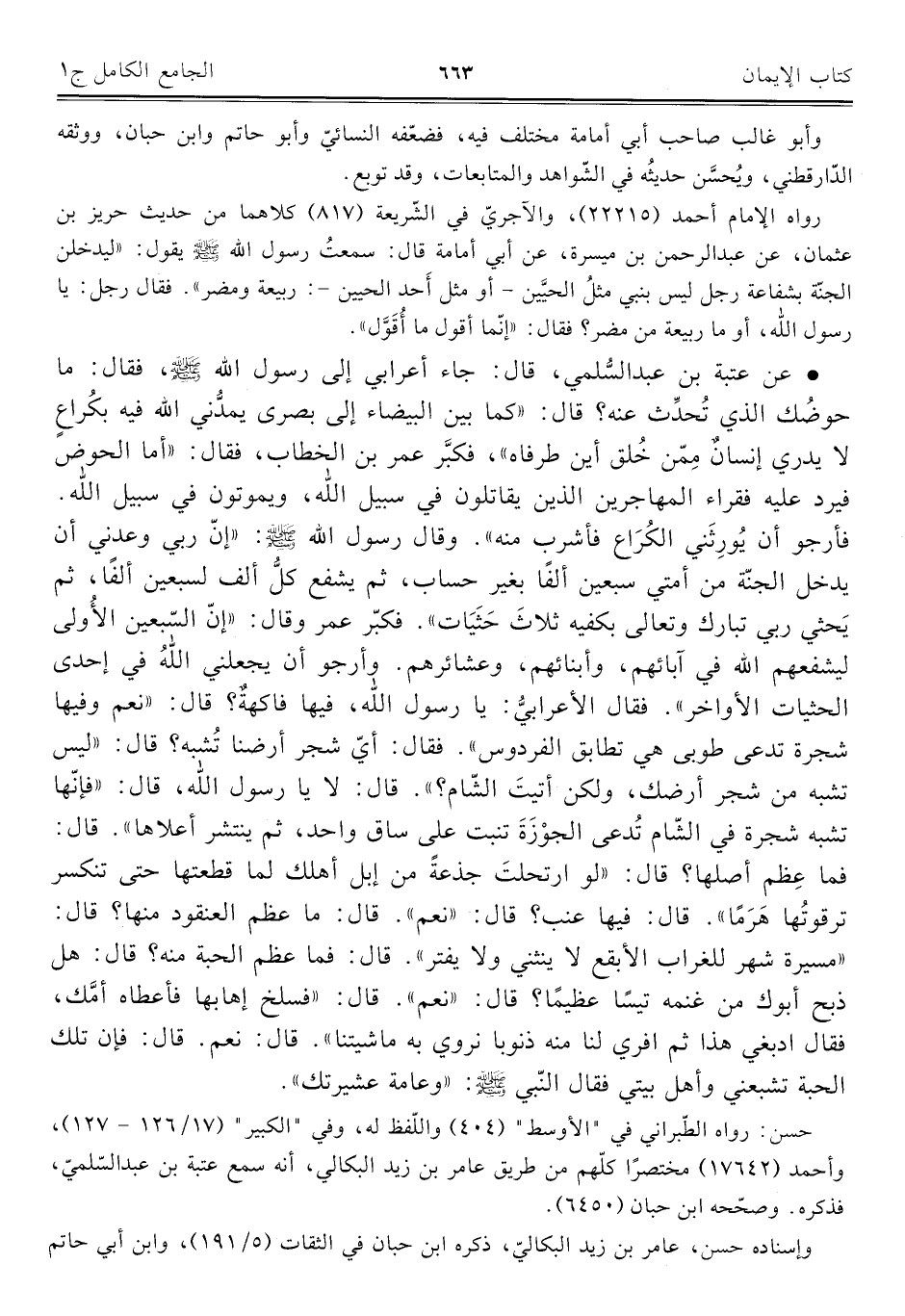 • عن عتبة بن عبد السُّلميّ، قال: جاء أعرابي إلى رسول اللَّه -صلى اللَّه عليه وسلم-، فقال: ما حوضُك الذي تُحدِّث عنه؟ قال: "كما بين البيضاء إلى بصري يمدُّني اللَّه فيه بكُراعٍ لا يدري إنسانٌ مِمَّن خُلق أين طرفاه"، فكبَّر عمر بن الخطّاب، فقال: "أما الحوض فيرد عليه فقراء المهاجرين الذين يقاتلون في سبيل اللَّه، ويموتون في سبيل اللَّه. فأرجو أن يُورِثَني الكُرَاع فأشرب منه". وقال رسول اللَّه -صلى اللَّه عليه وسلم-: "إنّ ربي وعدني أن يدخل الجنّة من أمتي سبعين ألفًا بغير حساب، ثم يشفع كلُّ ألف لسبعين ألفًا، ثم يَحثي ربي تبارك وتعالى بكفيه ثلاث حَثَيَات". فكبَّر عمر وقال: إنّ السَّبعين الأُوّلى ليشفعهم اللَّه في آبائهم، وأبنائهم، وعشائرهم. وأرجو أن يجعلني اللَّهُ في إحدى الحثيات الأواخر". فقال الأعرابيُّ: يا رسول اللَّه، فيها فاكهةٌ؟ قال: "نعم وفيها شجرة تدعى طوبى هي تطابق الفردوس". فقال: أيّ شجر أرضنا تُشبه؟ قال: "ليس تشبه من شجر أرضك، ولكن أتيتَ الشّام؟ ". قال: لا يا رسول اللَّه، قال: "فإنَّها تشبه شجرة في الشّام تُدعى الجوْزَةَ تنبت على ساق واحد، ثم ينتشر أعلاها". قال: فما عِظم أصلها؟ قال: "لو ارتحلتَ جذعةً من إبل أهلك لما قطعتها حتى تنكسر ترقوتُها هَرَمًا". قال: فيها عنب؟ قال: "نعم". قال: ما عظم العنقود منها؟ قال: "مسيرة شهر للغراب الأبقع لا ينثني ولا يفتر". قال: فما عظم الحبة منه؟ قال: هل ذبح أبوك من غنمه تيسًا عظيمًا؟ قال: "نعم". قال: فسلخ إهابها فأعطاه أمَّك، فقال ادبغي هذا ثم افري لنا منه ذنوبا نروي به ماشيتنا". قال: نعم. قال: فإن تلك الحبة تشبعني وأهل بيتي فقال النبيّ -صلى اللَّه عليه وسلم-: "وعامة عشيرتك".
