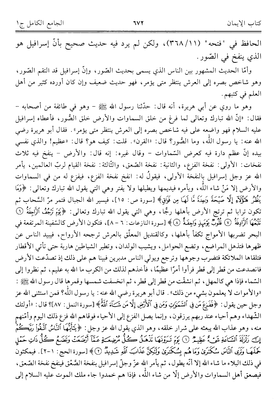وأمّا الحديث المشهور بين النّاس الذي يسمى بحديث الصّور، وإنَّ إسرافيل قد التقم الصّور، وهو شاخص بصره إلى العرش ينتظر متى يؤمر، فهو حديث ضعيف وإن كان أورده كثير من أهل العلم في كتبهم.