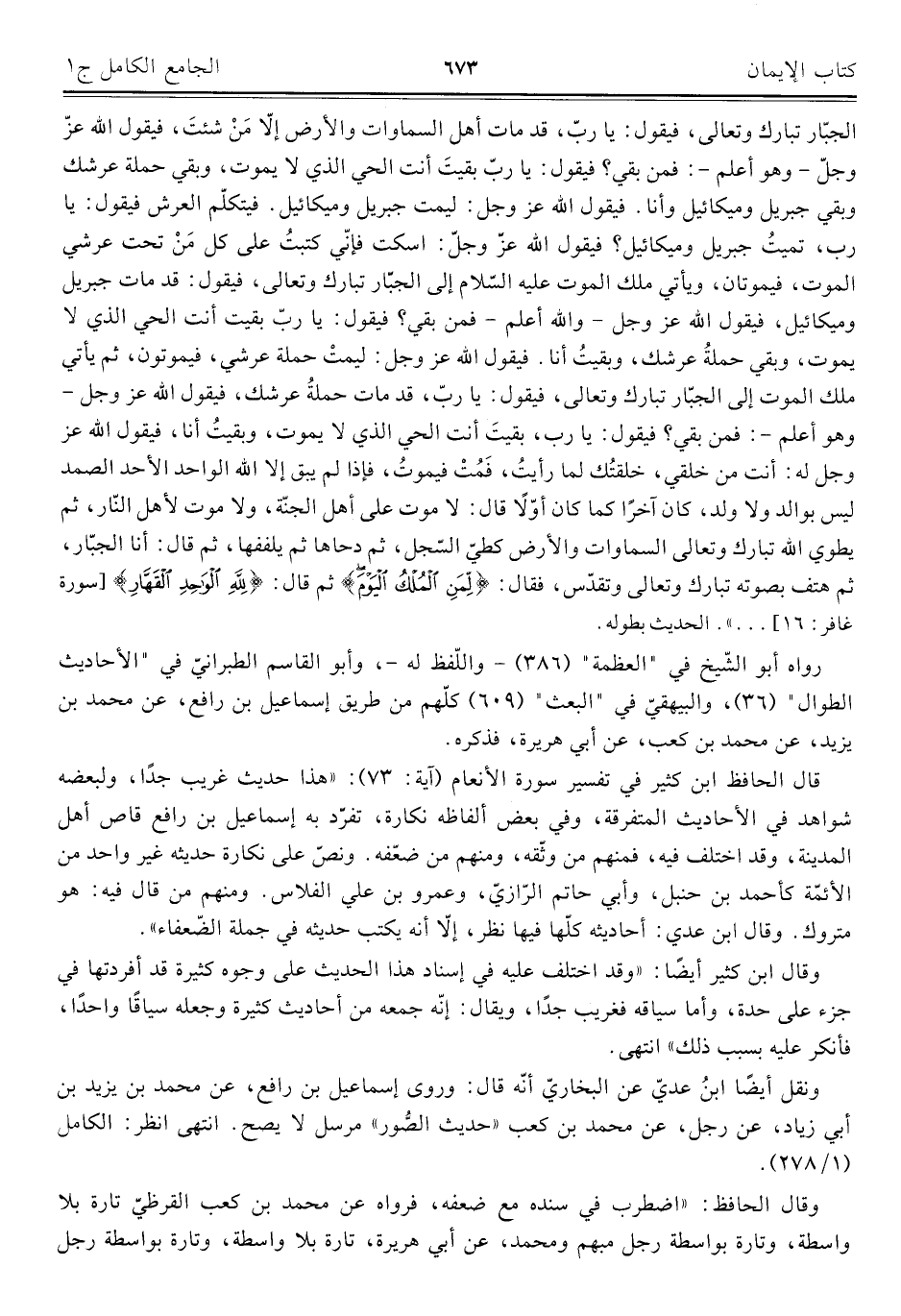 الجبّار تبارك وتعالى، فيقول: يا ربّ، قد مات أهل السماوات والأرض إِلَّا مَنْ شئتَ، فيقول اللَّه عَزَّ وَجَلَّ -وهو أعلم-: فمن بقي؟ فيقول: يا ربّ بقيتَ أنت الحي الذي لا يموت، وبقي حملة عرشك وبقي جبريل وميكائيل وأنا. فيقول اللَّه عزّ وجلّ: ليمت جبريل وميكائيل. فيتكلّم العرش فيقول: يا ربّ، تميتُ جبريل وميكائيل؟ فيقول اللَّه عزّ وجلّ: اسكت فإنِّي كتبتُ على كل مَنْ تحت عرشي الموت، فيموتان، ويأتي ملك الموت عليه السّلام إلى الجبَّار تبارك وتعالى، فيقول: قد مات جبريل وميكائيل، فيقول اللَّه عزّ وجلّ -واللَّه أعلم- فمن بقي؟ فيقول: يا ربّ بقيت أنت الحي الذي لا يموت، وبقي حملةُ عرشك، وبقيتُ أنا. فيقول اللَّه عزّ وجلّ: ليمتْ حملة عرشيّ، فيموتون، ثم يأتي ملك الموت إلى الجبَّار تبارك وتعالى، فيقول: يا ربّ، قد مات حملةُ عرشك، فيقول اللَّه عزّ وجلّ -وهو أعلم-: فمن بقي؟ فيقول: يا ربّ، بقيتَ أنت الحي الذي لا يموت، وبقيتُ أنا، فيقول اللَّه عَزَّ وَجَلَّ له: أنت من خلقيّ، خلقتُك لما رأيتُ، فَمُتْ فيموتُ، فإذا لم يبق إِلَّا اللَّه الواحد الأحد الصمد ليس بوالد ولا ولد، كان آخرًا كما كان أوَّلًا قال: لا موت على أهل الجنّة، ولا موت لأهل النّار، ثم يطوي اللَّه تبارك وتعالى السماوات والأرض كطيّ السّجل، ثم دحاها ثم يلففها، ثم قال: أنا الجبَّار، ثم هتف بصوته تبارك وتعالى وتقدَّس، فقال: {لِمَنِ الْمُلْكُ الْيَوْمَ} ثم قال: {لِلَّهِ الْوَاحِدِ الْقَهَّارِ} [سورة غافر: ١٦]. . . ". الحديث بطوله.