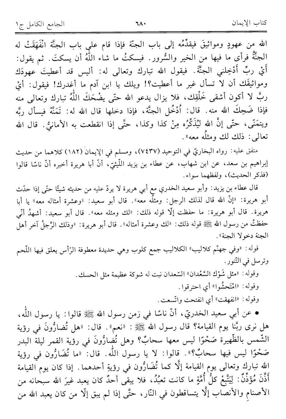 • عن أبي سعيد الخدريّ، أنّ ناسًا في زمن رسول اللَّه -صلى اللَّه عليه وسلم- قالوا: يا رسول اللَّه، هل نرى ربَّنا يوم القيامة؟ قال رسول اللَّه -صلى اللَّه عليه وسلم-: "نعم". قال: "هل تُضارُّونَ في رؤية الشّمس بالظّهيرة صَحْوًا ليس معها سحابٌ؟ وهل تُضارُّونَ في رؤية القمر ليلة البدر صَحْوًا ليس فيها سحابٌ؟ ". قالوا: لا يا رسول اللَّه. قال: "ما تُضَارُّون في رؤية اللَّه تبارك وتعالى يوم القيامة إِلَّا كما تُضَارُّون في رؤية أحدهما. إذا كان يوم القيامة أَذَّنَ مُؤَذِّنٌ: لِيَتَّبِعْ كلُّ أُمَّةٍ ما كانت تعبُدُ، فلا يبقى أحدٌ كان يعبد غيرَ اللَّه سبحانه من الأصنامِ والأنصاب إِلَّا يتساقطون في النّار، حتّى إذا لم يبق إِلَّا من كان يعبد اللَّه من