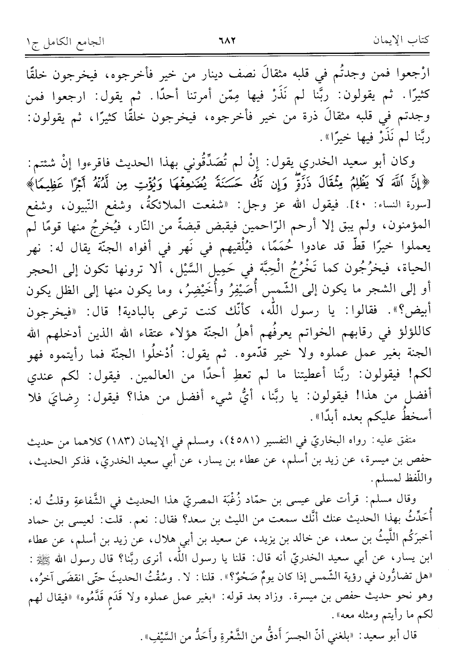 وكان أبو سعيد الخدري يقول: إِنْ لم تُصَدِّقُوني بهذا الحديث فاقرءوا إنْ شئتم: {إِنَّ اللَّهَ لَا يَظْلِمُ مِثْقَالَ ذَرَّةٍ وَإِنْ تَكُ حَسَنَةً يُضَاعِفْهَا وَيُؤْتِ مِنْ لَدُنْهُ أَجْرًا عَظِيمًا} [سورة النساء: ٤٠]. فيقول اللَّه عز وجل: "شفعت الملائكةُ، وشفع النّبيون، وشفع المؤمنون، ولم يبق إلا أرحم الرّاحمين فيقبض قبضةً من النّار، فيُخرجُ منها قومًا لم يعملوا خيرًا قطّ قد عادوا حُمَمًا، فيُلْقيهم في نَهر في أفواه الجنّة يقال له: نهر الحياة، فيخرُجُون كما تَخْرُجُ الْحِبَّة في حَمِيل السَّيْل، ألا ترونها تكون إلى الحجر أو إلى الشجر ما يكون إلى الشّمس أُصَيْفِرُ وأُخَيْضِرُ، وما يكون منها إلى الظل يكون أبيض؟ ". فقالوا: يا رسول اللَّه، كأنّك كنت ترعى بالبادية! قال: "فيخرجون كاللؤلؤ في رقابهم الخواتم يعرفُهم أهلُ الجنّة هؤلاء عتقاء اللَّه الذين أدخلهم اللَّه الجنّة بغير عمل عملوه ولا خير قدّموه. ثم يقول: ادْخلُوا الجنّة فما رأيتموه فهو لكم! فيقولون: ربَّنا أعطيتنا ما لم تعطِ أحدًا من العالمين. فيقول: لكم عندي أفضل من هذا؟ فيقولون: يا ربَّنا، أيُّ شيء أفضل من هذا؟ فيقول: رِضايَ فلا أسخطُ عليكم بعده أبدًا".