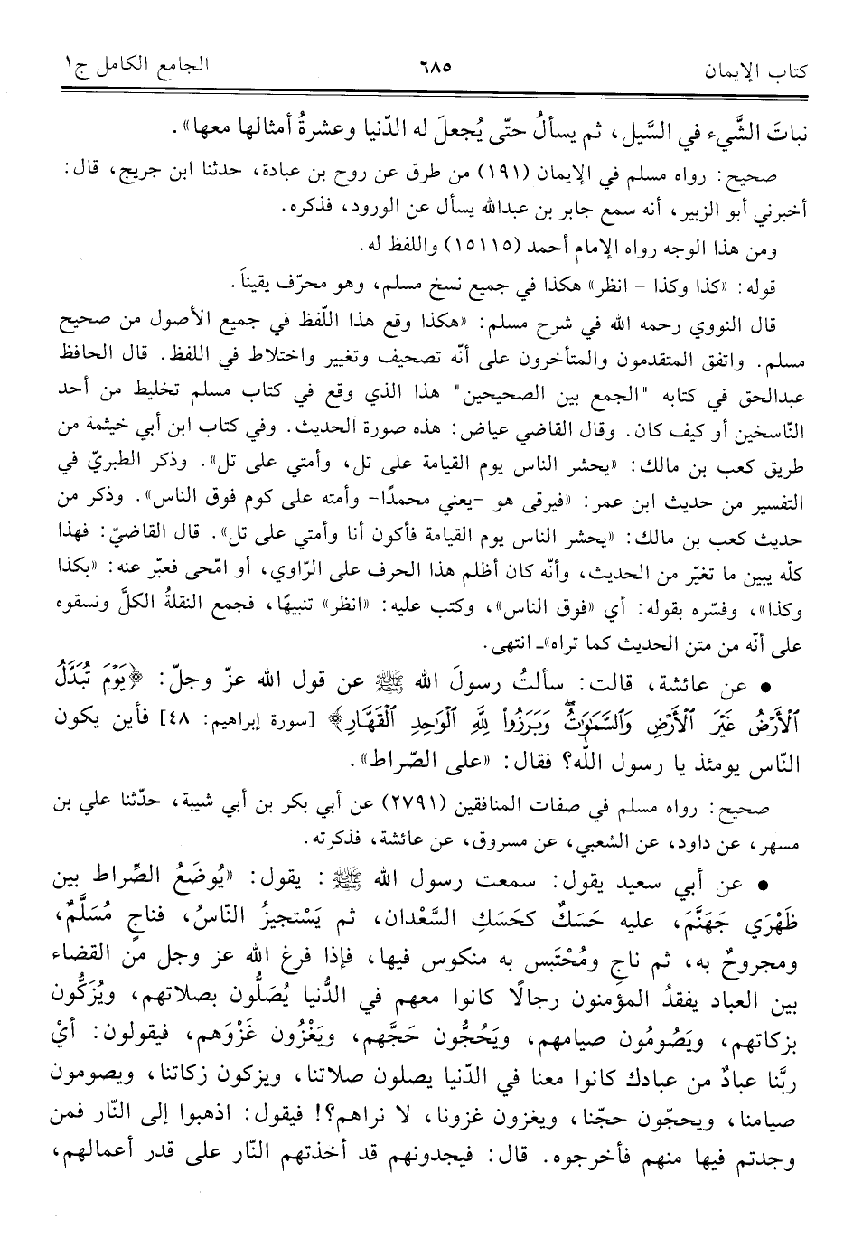 • عن عائشة، قالت: سألتُ رسولَ اللَّه -صلى اللَّه عليه وسلم- عن قول اللَّه عزّ وجلّ: {يَوْمَ تُبَدَّلُ الْأَرْضُ غَيْرَ الْأَرْضِ وَالسَّمَاوَاتُ وَبَرَزُوا لِلَّهِ الْوَاحِدِ الْقَهَّارِ} [سورة إبراهيم: ٤٨] فأين يكون النّاس يومئذ يا رسول اللَّه؟ فقال: "على الصراط".