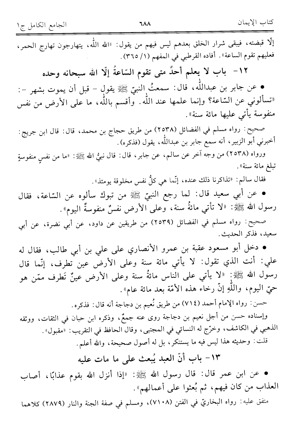 • عن جابر بن عبد اللَّه، قال: سمعتُ النبيّ -صلى اللَّه عليه وسلم- يقول -قبل أن يموت بشهر-: "تسألوني عن السّاعة؟ وإنما علمها عند اللَّه. وأقسم باللَّه، ما على الأرض من نفس منفوسة يأتي عليها مائة سنة".