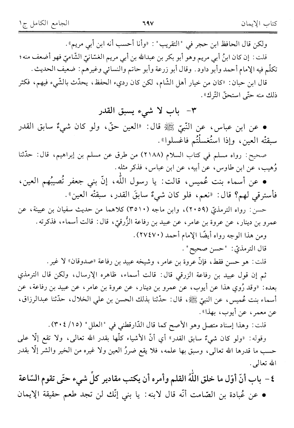 ٤ - باب أنّ أوّل ما خلق اللَّهُ القلم وأمره أن يكتب مقادير كلِّ شيء حتّى تقوم السّاعة