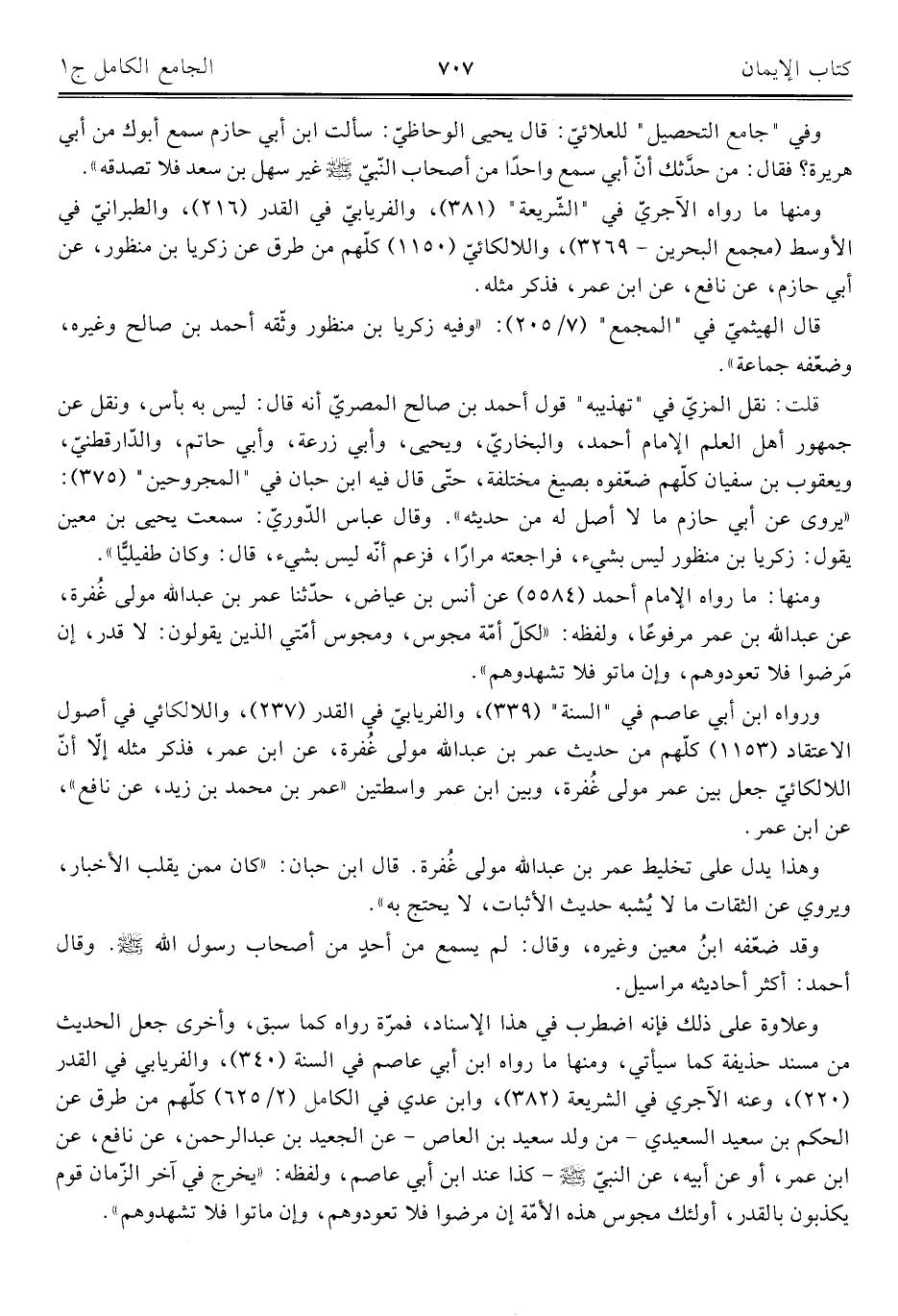 ومنها ما رواه الآجريّ في "الشّريعة" (٣٨١)، والفريابيّ في القدر (٢١٦)، والطبرانيّ في الأوسط (مجمع البحرين - ٣٢٦٩)، واللالكائيّ (١١٥٠) كلّهم من طرق عن زكريا بن منظور، عن أبي حازم، عن نافع، عن ابن عمر، فذكر مثله.