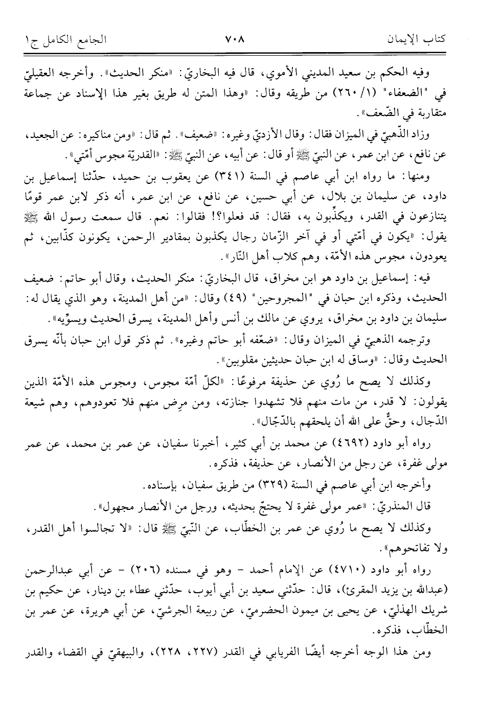 ومنها: ما رواه ابن أبي عاصم في السنة (٣٤١) عن يعقوب بن حميد، حدّثنا إسماعيل بن داود، عن سليمان بن بلال، عن أبي حسين، عن نافع، عن ابن عمر، أنه ذكر لابن عمر قومًا يتنازعون في القدر، ويكذِّبون به، فقال: قد فعلوا؟ ! فقالوا: نعم. قال سمعت رسول اللَّه -صلى اللَّه عليه وسلم- يقول: "يكون في أمّتي أو في آخر الزّمان رجال يكذبون بمقادير الرحمن، يكونون كذّابين، ثم يعودون، مجوس هذه الأمّة، وهم كلاب أهل النّار".