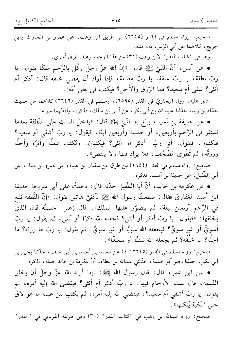 • عن حذيفة بن أسيد، يبلغ به النّبيَّ -صلى اللَّه عليه وسلم- قال: "يدخل الملك على النّطفة بعدما تستقر في الرَّحم بأربعين، أو خمسة وأربعين ليلة، فيقول: يا ربّ أشقي أو سعيد؟ فيكتبان، فيقول: أي ربّ! أذكر أو أنثى؟ فيكتبان. ويُكتب عملُه وأثرُه وأجلُه ورزقُه، ثم تُطْوى الصُّحُف، فلا يزاد فيها ولا ينقص".