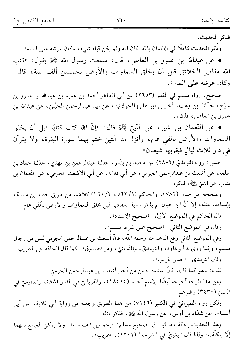 وصحّحه ابن حبان (٧٨٢)، والحاكم (١/ ٥٦٢، ٢/ ٢٦٠) كلاهما من طريق حماد بن سلمة، بإسناده، مثله، إلا أنّ ابن حبان لم يذكر كتابة المقادير قبل خلق السماوات والأرض بألفي عام.