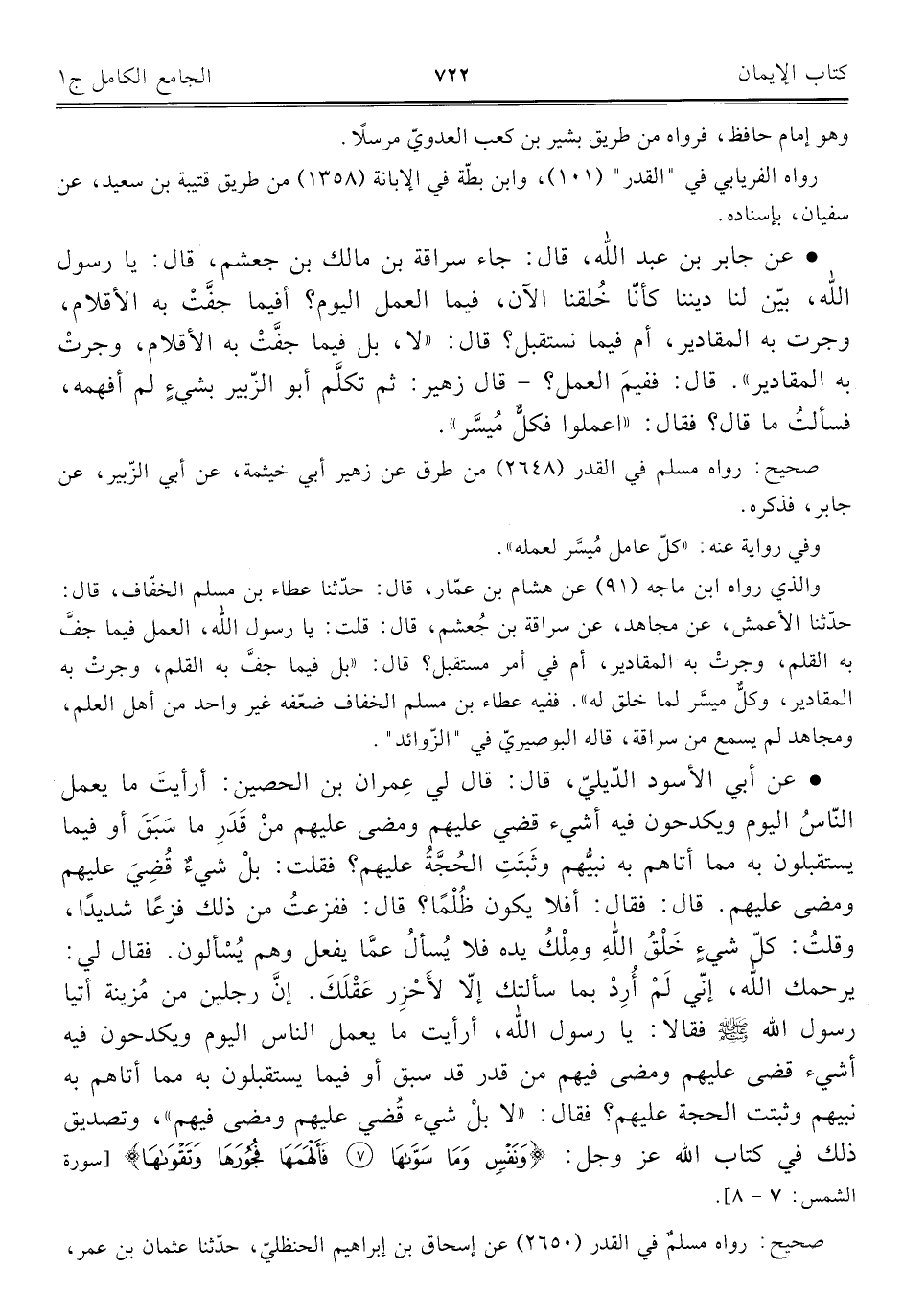 • عن جابر بن عبد اللَّه، قال: جاء سراقة بن مالك بن جعشم، قال: يا رسول اللَّه، بيّن لنا ديننا كأنّا خُلقنا الآن، فيما العمل اليوم؟ أفيما جفَّتْ به الأقلام، وجرت به المقادير، أم فيما نستقبل؟ قال: "لا، بل فيما جفَّتْ به الأقلام، وجرتْ به المقادير". قال: ففيمَ العمل؟ - قال زهير: ثم تكلَّم أبو الزّبير بشيءٍ لم أفهمه، فسألتُ ما قال؟ فقال: "اعملوا فكلٌّ مُيسَّر".