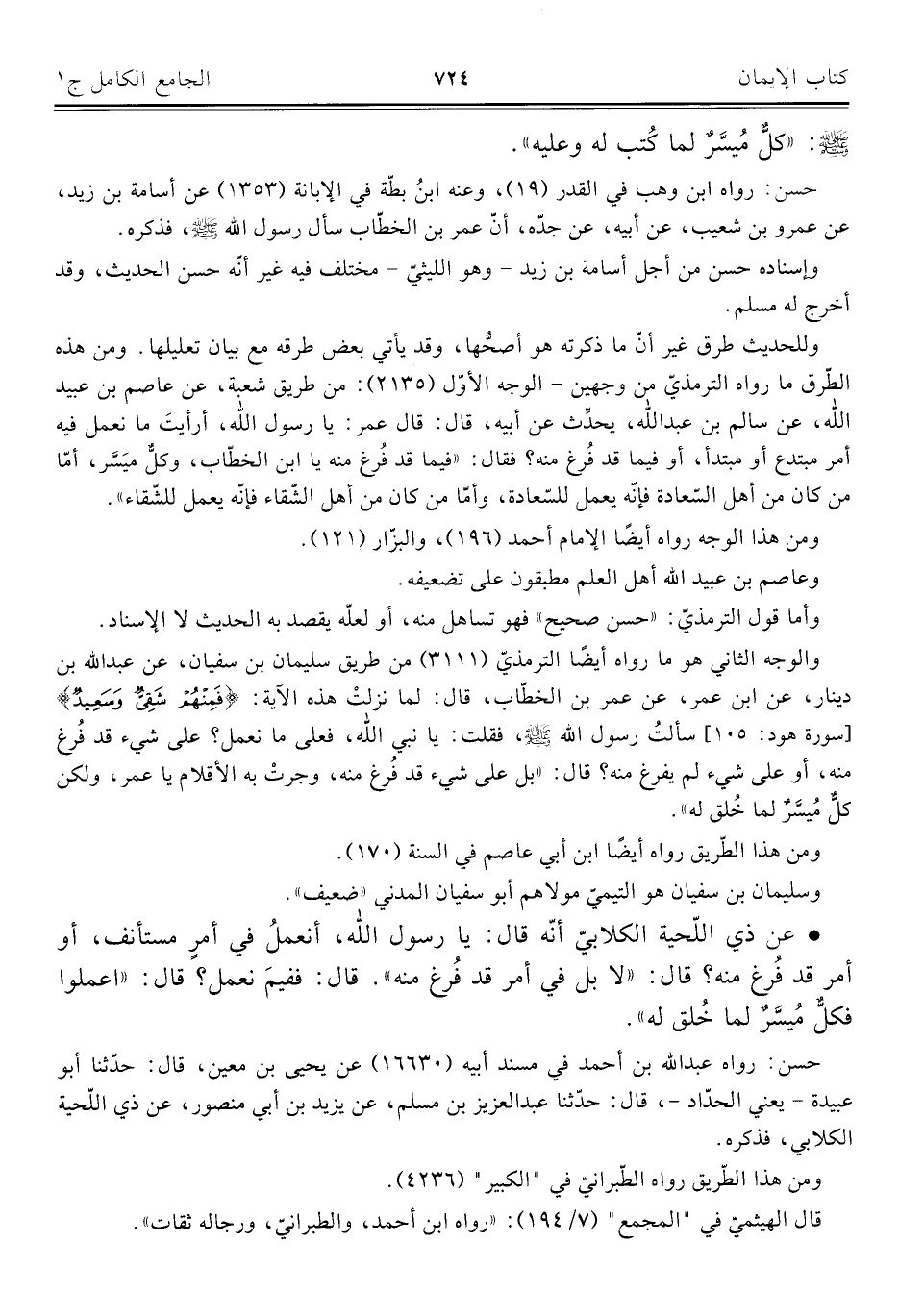 وللحديث طرق غير أنّ ما ذكرته هو أصحُّها، وقد يأتي بعض طرقه مع بيان تعليلها. ومن هذه الطّرق ما رواه الترمذيّ من وجهين - الوجه الأوّل (٢١٣٥): من طريق شعبة، عن عاصم بن عبيد اللَّه، عن سالم بن عبد اللَّه، يحدِّث عن أبيه، قال: قال عمر: يا رسول اللَّه، أرأيتَ ما نعمل فيه أمر مبتدع أو مبتدأ، أو فيما قد فُرغ منه؟ فقال: "فيما قد فُرغ منه يا ابن الخطّاب، وكلٌّ ميَسَّر، أمّا من كان من أهل السّعادة فإنّه يعمل للسّعادة، وأمّا من كان من أهل الشّقاء فإنّه يعمل للشّقاء".