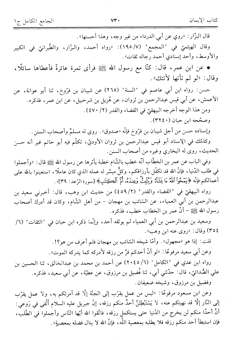وفي الباب عن عمر بن الخطّاب أنّه خطب بالشّام خطبة يأثرها عن رسول اللَّه -صلى اللَّه عليه وسلم- قال: "وأجملوا في طلب الدّنيا، فإنّ اللَّه قد تكفّل بأرزاقكم، وكلٌّ ميسَّر له عمله الذي كان عاملًا، استعينوا باللَّه على أعمالكم فإنّه {يَمْحُو اللَّهُ مَا يَشَاءُ وَيُثْبِتُ وَعِنْدَهُ أُمُّ الْكِتَابِ} [سورة الرعد: ٣٩] ".