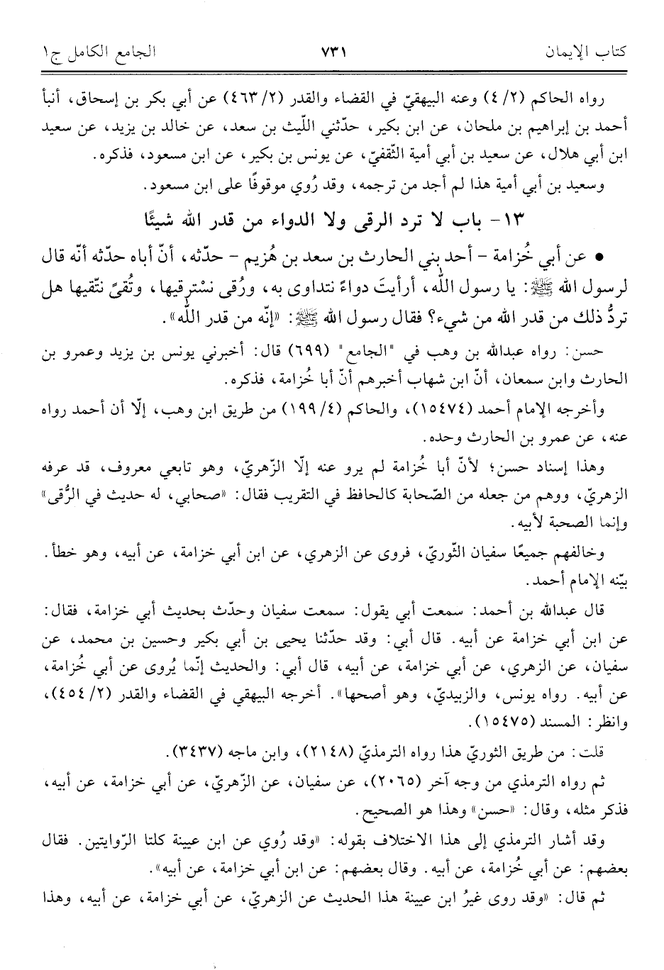 وهذا إسناد حسن؛ لأنّ أبا خُزامة لم يرو عنه إلّا الزّهريّ، وهو تابعي معروف، قد عرفه الزهريّ، ووهم من جعله من الصّحابة كالحافظ في التقريب فقال: "صحابي، له حديث في الرُّقي" وإنما الصحبة لأبيه.