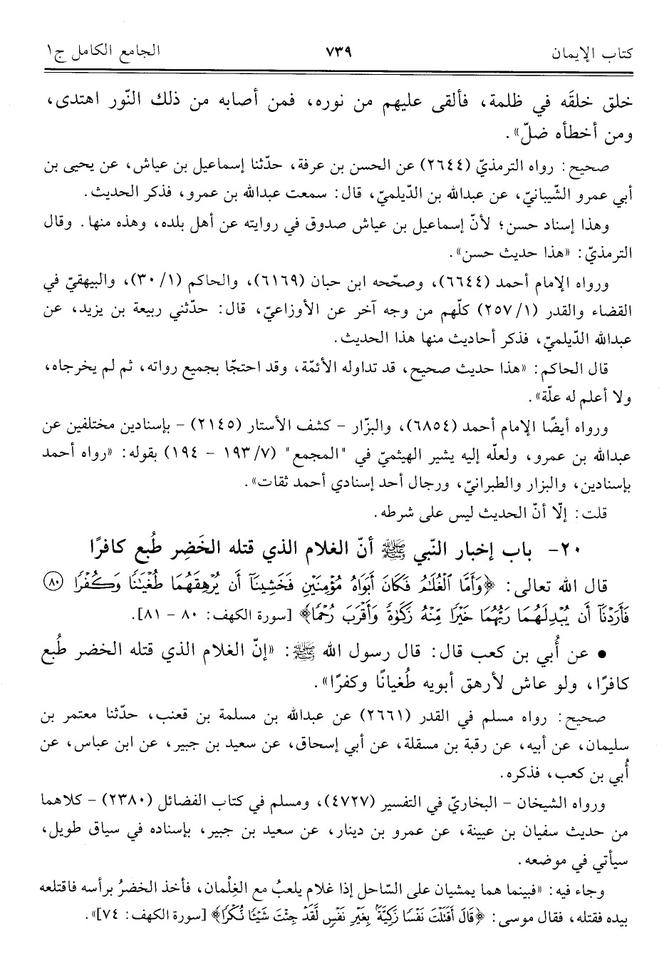 وجاء فيه: "فبينما هما يمشيان على السّاحل إذا غلام يلعبُ مع الغِلْمان، فأخذ الخضرُ برأسه فاقتلعه بيده فقتله، فقال موسى: {قَالَ أَقَتَلْتَ نَفْسًا زَكِيَّةً بِغَيْرِ نَفْسٍ لَقَدْ جِئْتَ شَيْئًا نُكْرًا} [سورة الكهف: ٧٤] ".