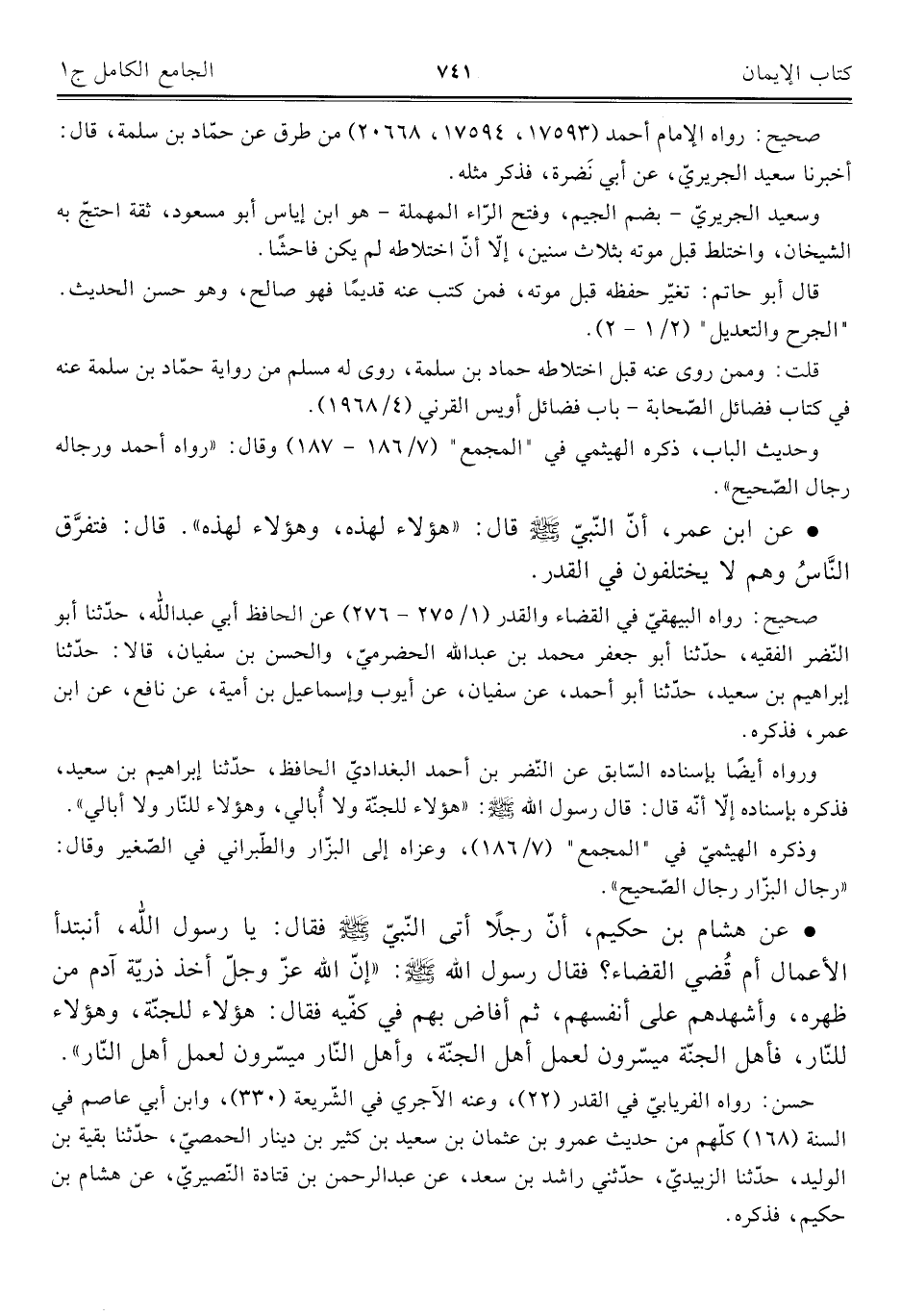حسن: رواه الفريابيّ في القدر (٢٢)، وعنه الآجريّ في الشّريعة (٣٣٠)، وابن أبي عاصم في السنة (١٦٨) كلّهم من حديث عمرو بن عثمان بن سعيد بن كثير بن دينار الحمصيّ، حدّثنا بقية بن الوليد، حدّثنا الزبيديّ، حدّثني راشد بن سعد، عن عبد الرحمن بن قتادة النّصيريّ، عن هشام بن حكيم، فذكره.