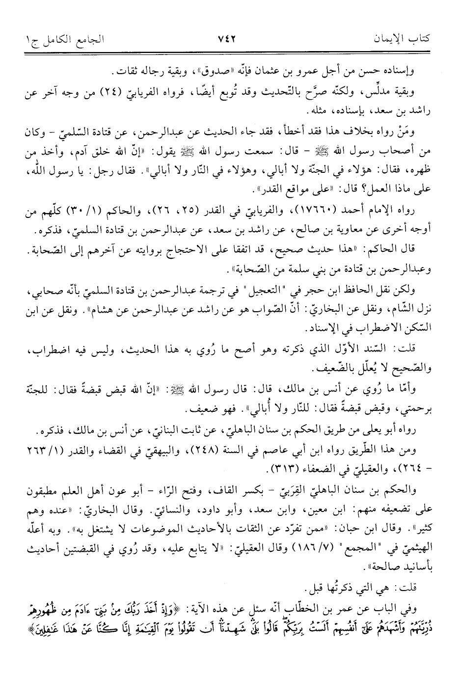 ومَنْ رواه بخلاف هذا فقد أخطأ، فقد جاء الحديث عن عبد الرحمن، عن قتادة السّلميّ -وكان من أصحاب رسول اللَّه -صلى اللَّه عليه وسلم- قال: سمعت رسول اللَّه -صلى اللَّه عليه وسلم- يقول: "إنّ اللَّه خلق آدم، وأخذ من ظهره، فقال: هؤلاء في الجنّة ولا أبالي، وهؤلاء في النّار ولا أبالي". فقال رجل: يا رسول اللَّه، على ماذا العمل؟ قال: "على مواقع القدر".