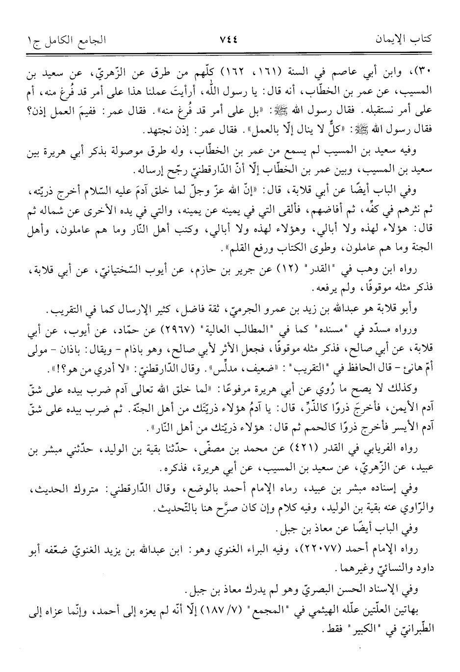 ٣٠)، وابن أبي عاصم في السنة (١٦١، ١٦٢) كلّهم من طرق عن الزّهريّ، عن سعيد بن المسيب، عن عمر بن الخطّاب، أنه قال: يا رسول اللَّه، أرأيتَ عملنا هذا على أمر قد فُرغ منه، أم على أمر نستقبله. فقال رسول اللَّه -صلى اللَّه عليه وسلم-: "بل على أمر قد فُرغ منه". فقال عمر: ففيمَ العمل إذن؟ فقال رسول اللَّه -صلى اللَّه عليه وسلم-: "كلٌّ لا ينال إِلَّا بالعمل". فقال عمر: إذن نجتهد.