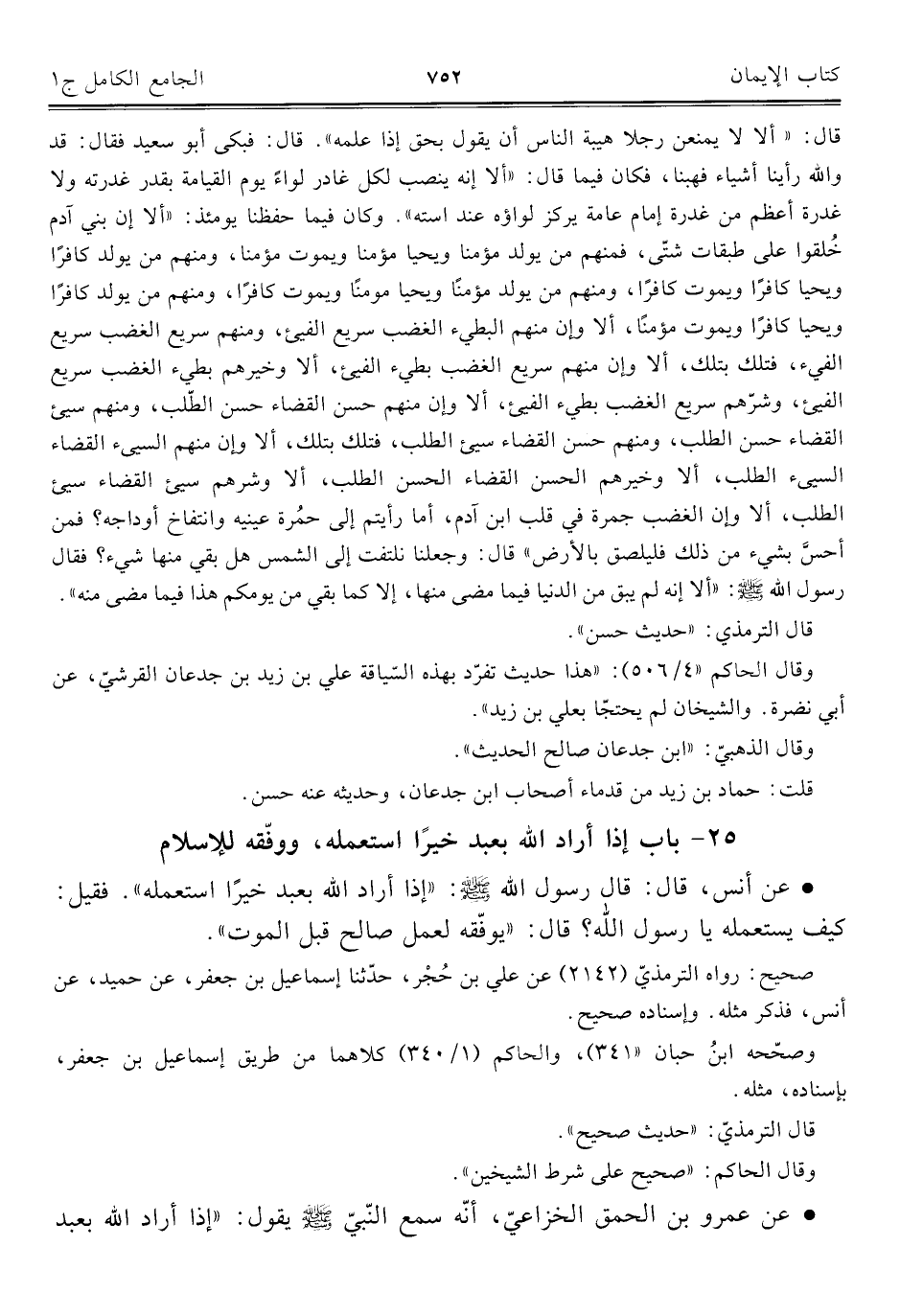 قال: "ألا لا يمنعن رجلًا هيبة النّاس أن يقول بحق إذا علمه". قال: فبكى أبو سعيد فقال: قد واللَّه رأينا أشياء فهبنا، فكان فيما قال: "ألا إنه ينصب لكل غادر لواءً يوم القيامة بقدر غدرته ولا غدرة أعظم من غدرة إمام عامة بركز لواؤه عند استه". وكان فيما حفظنا يومئذ: "ألا إن بني آدم خُلقوا على طبقات شتّى، فمنهم من يولد مؤمنًا ويحيا مؤمنًا ويموت مؤمنًا، ومنهم من يولد كافرًا ويحيا كافرًا ويموت كافرًا، ومنهم من يولد مؤمنًا ويحيا مؤمنًا ويموت كافرًا، ومنهم من يولد كافرًا ويحيا كافرًا ويموت مؤمنًا، ألا وإن منهم البطيء الغضب سريع الفيئ، ومنهم سريع الغضب سريع الفيء، فتلك بتلك، ألا وإن منهم سريع الغضب بطيء الفيئ، ألا وخيرهم بطيء الغضب سريع الفيئ، وشرّهم سريع الغضب بطيء الفيئ، ألا وإن منهم حسن القضاء حسن الطّلب، ومنهم سيئ القضاء حسن الطلب، ومنهم حسن القضاء سيئ الطلب، فتلك بتلك، ألا وإن منهم السيئ القضاء السيء الطلب، ألا وخيرهم الحسن القضاء الحسن الطلب، ألا وشرهم سيئ القضاء سيئ الطلب، ألا وإن الغضب جمرة في قلب ابن آدم، أما رأيتم إلى حمُرة عينيه وانتفاخ أوداجه؟ فمن أحسَّ بشيء من ذلك فليلصق بالأرض" قال: وجعلنا نلتفت إلى الشّمس هل بقي منها شيء؟ فقال رسول اللَّه -صلى اللَّه عليه وسلم-: "ألا إنه لم يبق من الدنيا فيما مضى منها، إِلَّا كما بقي من يومكم هذا فيما مضى منه".