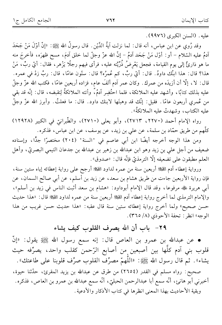 • عن عبد اللَّه بن عمرو بن العاص قال: إنه سمع رسول اللَّه -صلى اللَّه عليه وسلم- يقول: "إنّ قلوب بني آدم كلَّها بين أصبعين من أصابع الرّحمن كقلب واحد، يصرِّفه حيث يشاء". ثم قال رسول اللَّه -صلى اللَّه عليه وسلم-: "اللهمّ مصرِّف القلوب صرِّف قلوبنا على طاعتك".