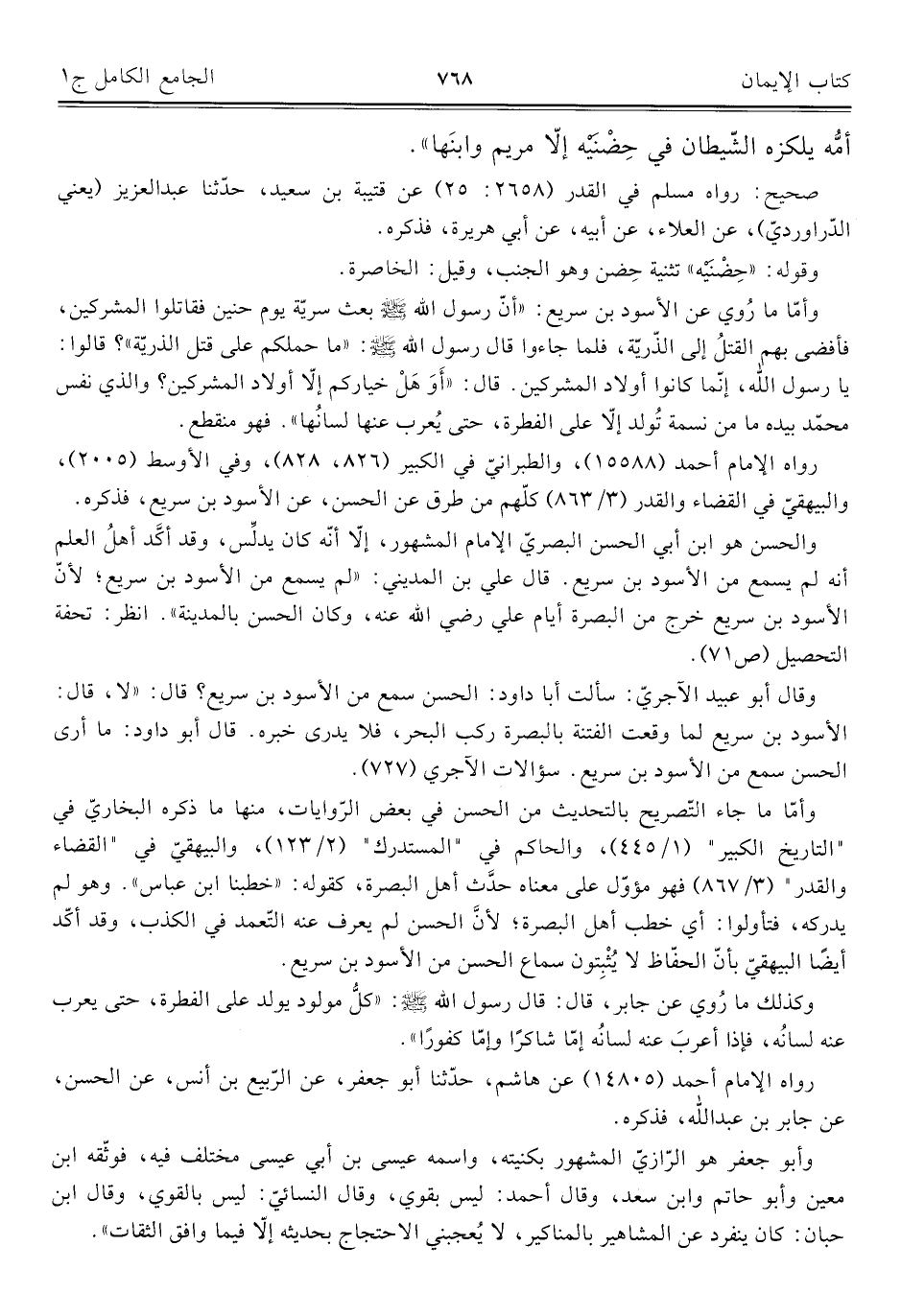 وأمّا ما رُوي عن الأسود بن سريع: "أنّ رسول اللَّه -صلى اللَّه عليه وسلم- بعث سريّة يوم حنين فقاتلوا المشركين، فأفضى بهم القتلُ إلى الذّريّة، فلما جاءوا قال رسول اللَّه -صلى اللَّه عليه وسلم-: "ما حملكم على قتل الذريّة"؟ قالوا: يا رسول اللَّه، إنّما كانوا أولاد المشركين. قال: "أَوَ هَلْ خياركم إلّا أولاد المشركين؟ والذي نفس محمّد بيده ما من نسمة تُولد إلّا على الفطرة، حتى يُعرب عنها لسانُها". فهو منقطع.