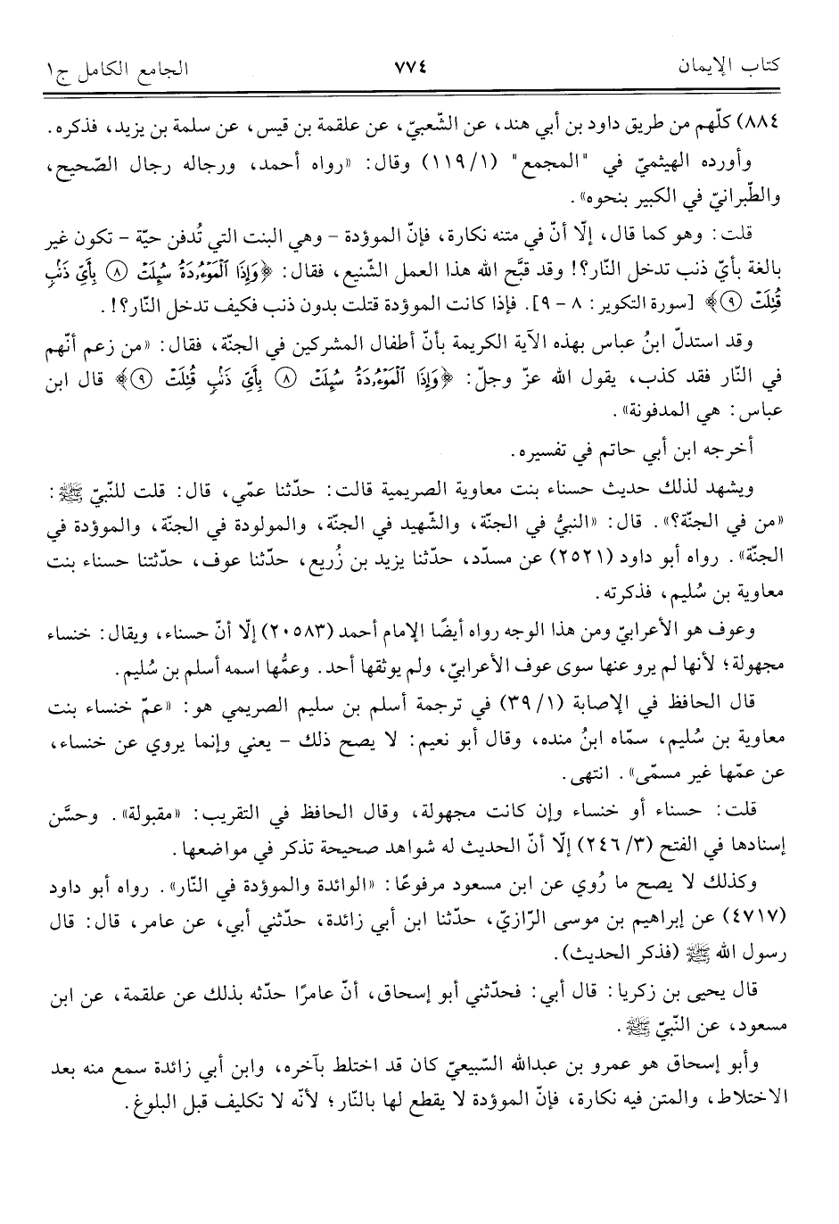 قلت: وهو كما قال، إلّا أنّ في متنه نكارة، فإنّ الموؤدة -وهي البنت التي تُدفن حيّة- تكون غير بالغة بأيّ ذنب تدخل النّار؟ ! وقد قبَّح اللَّه هذا العمل الشّنيع، فقال: {وَإِذَا الْمَوْءُودَةُ سُئِلَتْ (٨) بِأَيِّ ذَنْبٍ قُتِلَتْ (٩)} [سورة التكوير: ٨ - ٩]. فإذا كانت الموؤدة قتلت بدون ذنب فكيف تدخل النّار؟ ! .