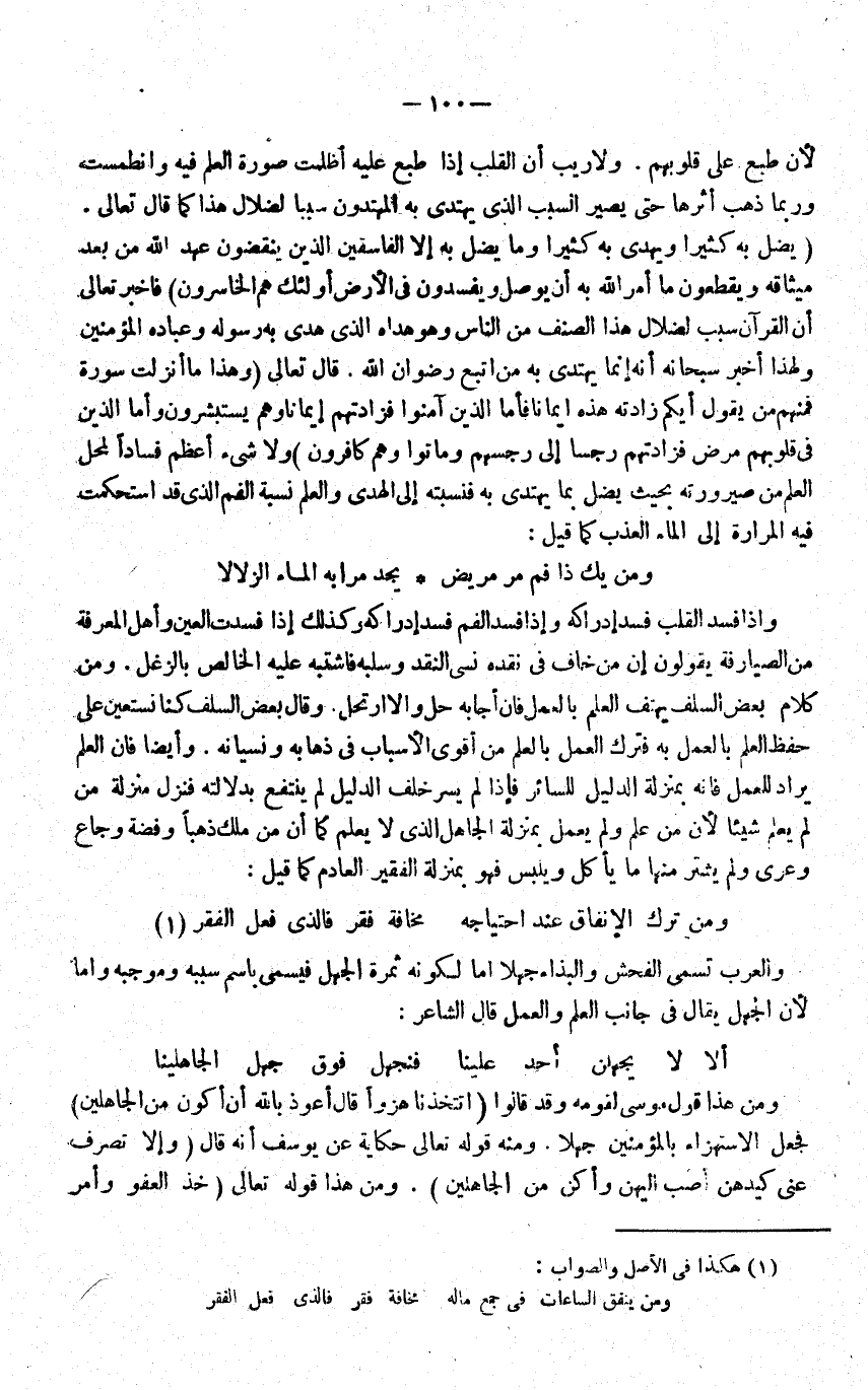 لَان طبع على قُلُوبهم وَلَا ريب ان الْقلب اذا طبع عَلَيْهِ اظلمت صُورَة الْعلم فِيهِ وانطمست وَرُبمَا ذهب اثرها حَتَّى يصير السَّبَب الَّذِي يَهْتَدِي بِهِ المهتدون سَببا لضلال هَذَا كَمَا قَالَ تَعَالَى {يضل بِهِ كثيرا وَيهْدِي بِهِ كثيرا وَمَا يضل بِهِ إِلَّا الْفَاسِقين الَّذين ينقضون عهد الله من بعد ميثاقه ويقطعون مَا أَمر الله بِهِ أَن يُوصل ويفسدون فِي الأَرْض أُولَئِكَ هم الخاسرون} فاخبر تَعَالَى ان الْقُرْآن سَبَب لضلال هَذَا الصِّنْف من النَّاس وهوهداه الَّذِي هدى بِهِ رَسُوله وعباده الْمُؤمنِينَ وَلِهَذَا اخبر سُبْحَانَهُ إِنَّه إِنَّمَا يَهْتَدِي بِهِ من اتبع رضوَان الله قَالَ تَعَالَى {وَإِذا مَا أنزلت سُورَة فَمنهمْ من يَقُول أَيّكُم زادته هَذِه إِيمَانًا فَأَما الَّذين آمنُوا فزادتهم إِيمَانًا وهم يستبشرون وَأما الَّذين فِي قُلُوبهم مرض فزادتهم رجسا إِلَى رجسهم وماتوا وهم كافرون} وَلَا شَيْء اعظم فَسَادًا لمحل الْعلم من صَيْرُورَته بِحَيْثُ يضل بِمَا يَهْتَدِي بِهِ فنسبته الى الْهدى وَالْعلم نِسْبَة الْفَم الَّذِي قد استحكمت فِيهِ المرارة الى المَاء العذب كَمَا قيل: