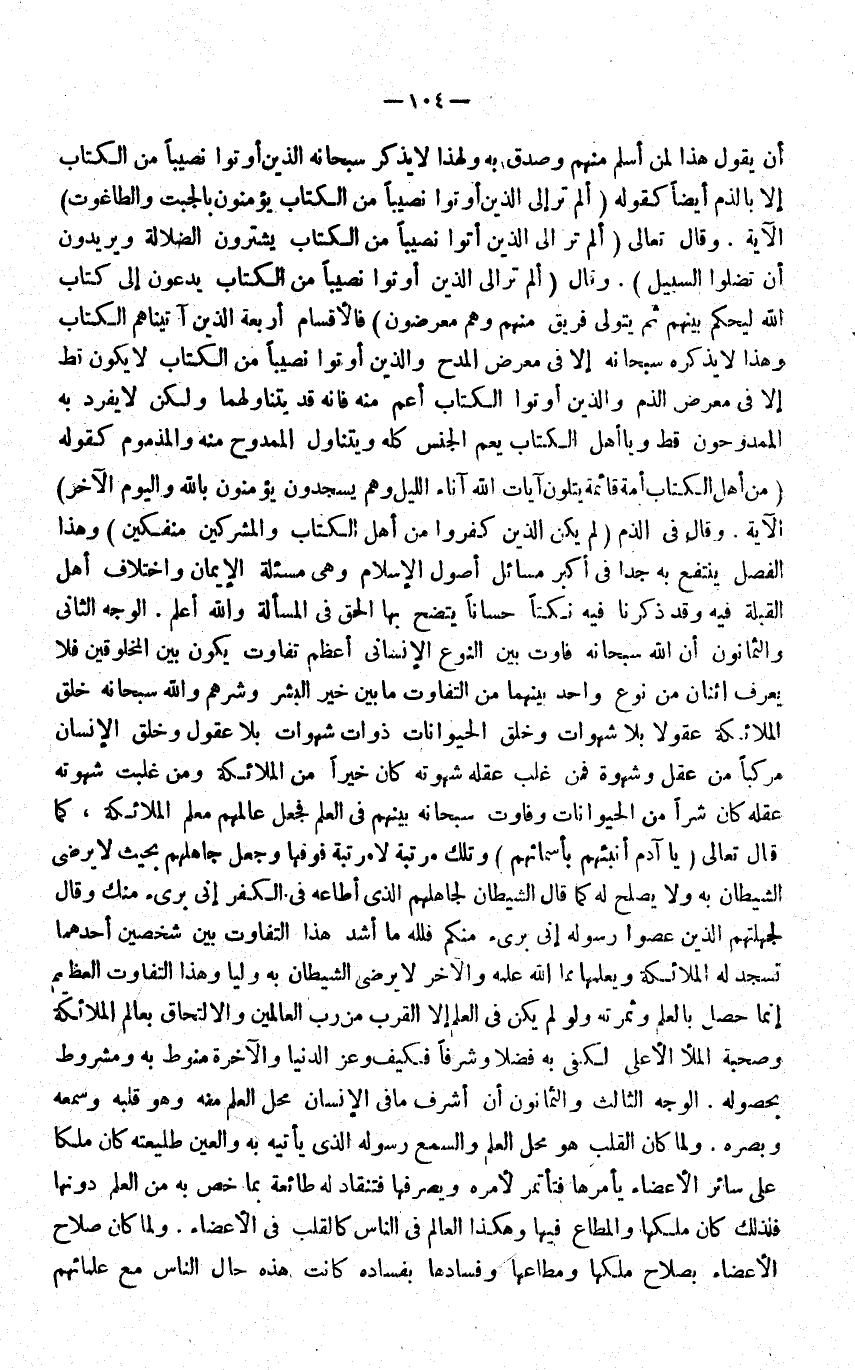 ان يَقُول هَذَا لمن اسْلَمْ مِنْهُم وَصدق بِهِ وَلِهَذَا لَا يذكر سُبْحَانَهُ الَّذين اوتوا نَصِيبا من الْكتاب الا بالذم ايضا كَقَوْلِه {ألم تَرَ إِلَى الَّذين أُوتُوا نَصِيبا من الْكتاب يُؤمنُونَ بالجبت والطاغوت} الاية وَقَالَ تَعَالَى {ألم تَرَ إِلَى الَّذين أُوتُوا نَصِيبا من الْكتاب يشْتَرونَ الضَّلَالَة ويريدون أَن تضلوا السَّبِيل} وَقَالَ {ألم تَرَ إِلَى الَّذين أُوتُوا نَصِيبا من الْكتاب يدعونَ إِلَى كتاب الله ليحكم بَينهم ثمَّ يتَوَلَّى فريق مِنْهُم وهم معرضون} فالاقسام اربعة الَّذين آتَيْنَاهُم الْكتاب وَهَذَا لَا يذكرهُ سُبْحَانَهُ إِلَّا فِي معرض الْمَدْح وَالَّذين اوتوا نَصِيبا من الْكتاب لَا يكون قطّ الا فِي معرض الذَّم وَالَّذين اوتوا الْكتاب اعم مِنْهُ فانه قد يتناولهما وَلَكِن لَا يفرد بِهِ الممدوحون قطّ وَيَا أهل الْكتاب يعم الْجِنْس كُله ويتناول الممدوح مِنْهُ والمذموم كَقَوْلِه من اهل الْكتاب امة قَائِمَة يَتلون آيَات الله آنَاء اللَّيْل وهم يَسْجُدُونَ يُؤمنُونَ بِاللَّه وَالْيَوْم الاخر الْآيَة وَقَالَ فِي الذَّم {لم يكن الَّذين كفرُوا من أهل الْكتاب وَالْمُشْرِكين منفكين} وَهَذَا الْفَصْل ينْتَفع بِهِ جدا فِي أكبر مسَائِل اصول الاسلام وَهِي مسئلة الايمان وَاخْتِلَاف اهل الْقبْلَة فِيهِ وَقد ذكرنَا فِيهِ نكتا حسانا يَتَّضِح بهَا الْحق فِي الْمَسْأَلَة وَالله اعْلَم الْوَجْه الثَّانِي وَالثَّمَانُونَ ان الله سُبْحَانَهُ فاوت بَين النَّوْع الانساني اعظم تفَاوت يكون بَين المخلوقين فَلَا يعرف اثْنَان من نوع وَاحِد بَينهمَا من التَّفَاوُت مَا بَين خير الْبشر وشرهم وَالله سُبْحَانَهُ خلق الْمَلَائِكَة عقولا بِلَا شهوات وَخلق الْحَيَوَانَات ذَوَات شهوات بِلَا عقول وَخلق الانسان مركبا من عقل وشهوة فَمن غلب عقله شَهْوَته كَانَ خيرا من الْمَلَائِكَة وَمن غلبت شَهْوَته عقله كَانَ شرا من الْحَيَوَانَات وفاوت سُبْحَانَهُ بَينهم فِي الْعلم فَجعل عالمهم معلم الْمَلَائِكَة كَمَا قَالَ تَعَالَى {يَا آدم أنبئهم بِأَسْمَائِهِمْ} وَتلك مرتبَة لَا مرتبَة فَوْقهَا وَجعل جاهلهم بِحَيْثُ لَا يرضى الشَّيْطَان بِهِ وَلَا يصلح لَهُ كَمَا قَالَ الشَّيْطَان لجاهلهم الَّذِي اطاعه فِي الْكفْر {إِنِّي بَرِيء مِنْك} وَقَالَ لجهلتهم الَّذين عصوا رَسُوله إِنِّي بَرِيء مِنْكُم فَللَّه مَا أَشد هَذَا التَّفَاوُت بَين شَخْصَيْنِ احدهما تسْجد لَهُ الْمَلَائِكَة وَيعلمهَا مِمَّا الله علمه والاخر لَا يرضى الشَّيْطَان بِهِ وليا وَهَذَا التَّفَاوُت الْعَظِيم إِنَّمَا حصل بِالْعلمِ وثمرته وَلَو لم يكن فِي الْعلم الا الْقرب من رب الْعَالمين والالتحاق بعالم الْمَلَائِكَة وصحبة الْمَلأ الاعلى لكفى بِهِ فضلا وشرفا فَكيف وَعز الدُّنْيَا وَالْآخِرَة مَنُوط بِهِ ومشروط بحصوله الْوَجْه الثَّالِث وَالثَّمَانُونَ ان اشرف مَا فِي الانسان مَحل الْعلم مِنْهُ وَهُوَ قلبه وسَمعه وبصره وَلما كَانَ الْقلب هُوَ مَحل الْعلم والسمع رَسُوله الَّذِي ياتيه بِهِ وَالْعين طليعته كَانَ ملكا على سَائِر الاعضاء يأمرها فتاتمر لامره ويصرفها فتنقاد لَهُ طَائِعَة بِمَا خص بِهِ من الْعلم دونهَا فَلذَلِك كَانَ ملكهَا والمطاع فِيهَا وَهَكَذَا الْعَالم فِي النَّاس كالقلب فِي الاعضاء وَلما كَانَ صَلَاح الاعضاء بصلاح ملكهَا ومطاعها وفسادها بفساده كَانَت هَذِه حَال النَّاس مَعَ عُلَمَائهمْ